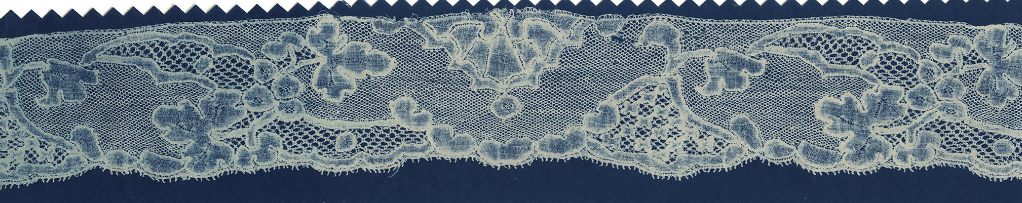 Blauwdruk van een strook Mechelse kloskant van een 'fijne kap', gedragen op het eiland Marken. Deze kant is te dateren in het midden van de achttiende eeuw. De blauwdruk is vervaardigd door NOM-medewerkers tijdens veldwerk in 1943.
