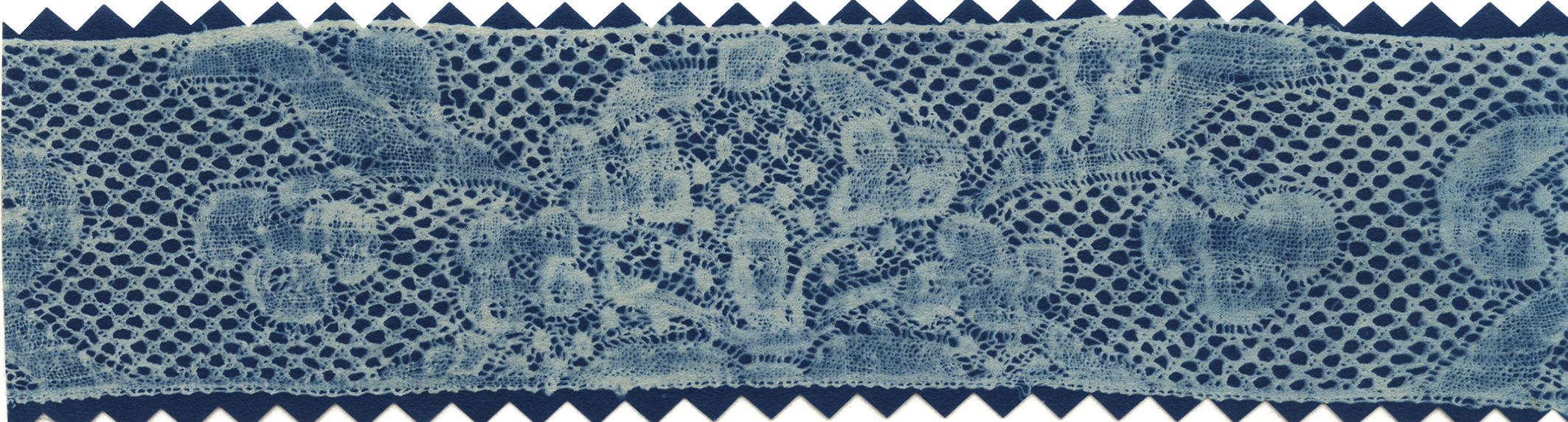 Blauwdruk van een strook Valenciennes kloskant aan een 'fijne kap', gedragen op het eiland Marken. De kant heeft een zogenaamde vijfgaatjesgrond, ook wel 'cinq trous grond' genoemd. Het patroon van deze kant is nogal primitief en minder verfijnd dan dat van kanten geproduceerd in een belangrijk kantcentrum. De detaillering is erg vervaagd, wat wijst op ...