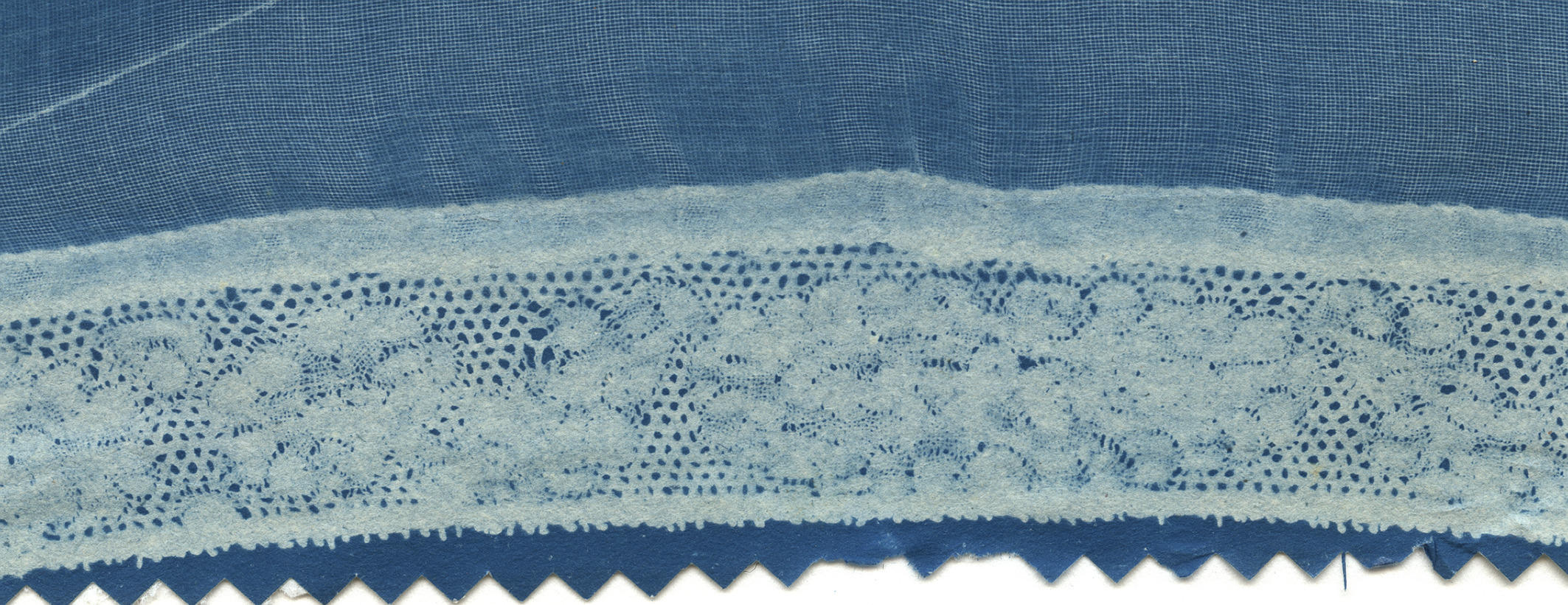 Blauwdruk van een strook Hollandse kloskant aan een 'fijne kap', gedragen op het eiland Marken. Deze Vlaamse kant wordt gerekend tot de zogenaamde Hollandse kanten. Binnen de groep van Hollandse kanten wordt dit type ook wel bloemkoolkant genoemd. De kant is te dateren vanaf omstreeks 1660 en lijkt wat minder gedetailleerd dan de beste zeventiende-eeuwse ...