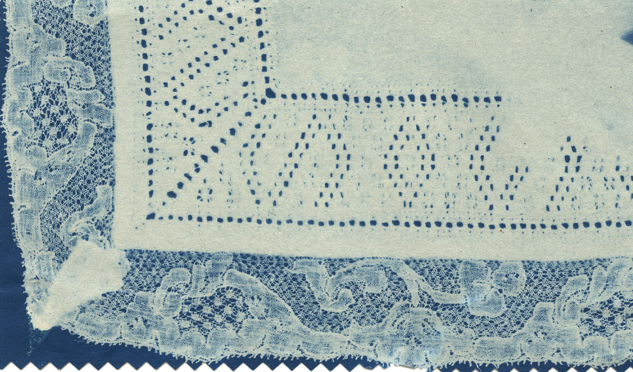 Detail van een doekje met sneewerk en Mechelse kant, Marken (blauwdruk (reproductie))