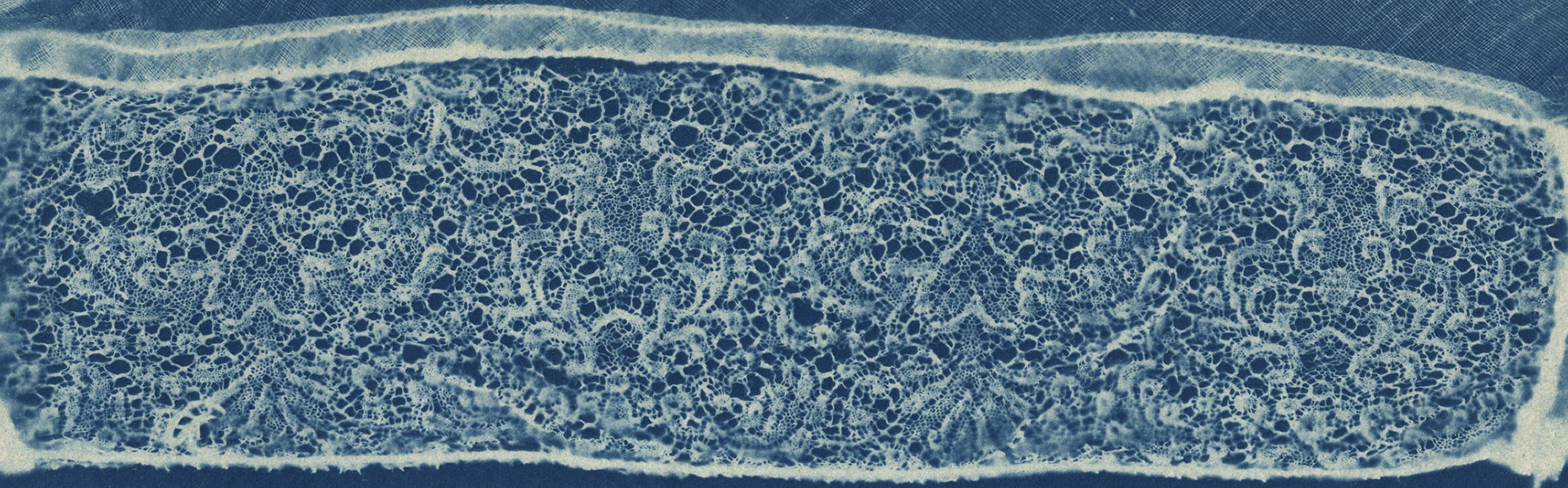 Blauwdruk van een strook Binche kloskant aan een 'hullekap', gedragen op het eiland Marken. De kant dateert uit het eind van de zeventiende eeuw of het begin van de achttiende eeuw. De blauwdruk is vervaardigd door NOM-medewerkers tijdens veldwerk in 1943.