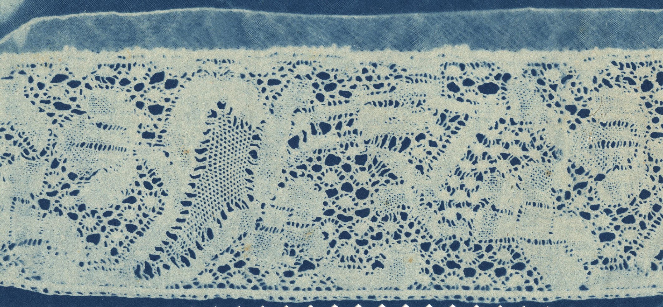 Blauwdruk van een strook Point de fée aan een 'hullekap', gedragen op het eiland Marken. Deze Point de fée is een twintigste-eeuwse versie van de achttiende-eeuwse Binche. Brugge was het centrum van deze kantsoort. Dit patroon heet 'de mentebolle'. De mentebolle werd met een fijnere draad geklost. Deze kant dateert uit het eerste kwart van ...