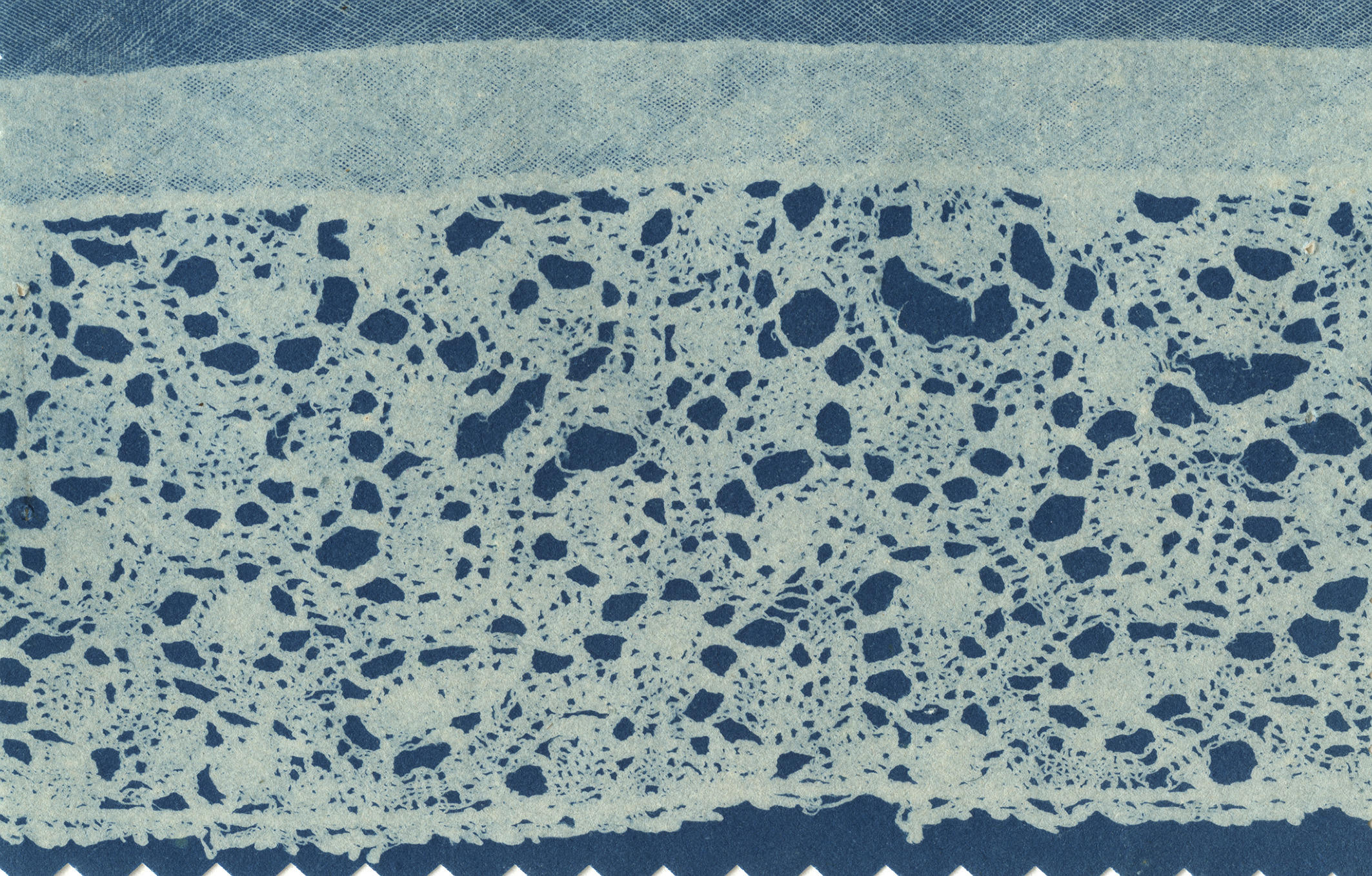 Blauwdruk van een kantstrook aan een 'hullekap', gedragen op het eiland Marken. Deze Vlaamse kant met doorlopende draden is een directe voorloper van de Binche. De kant dateert uit het eind van de zeventiende eeuw. De blauwdruk is vervaardigd door NOM-medewerkers tijdens veldwerk in 1943.