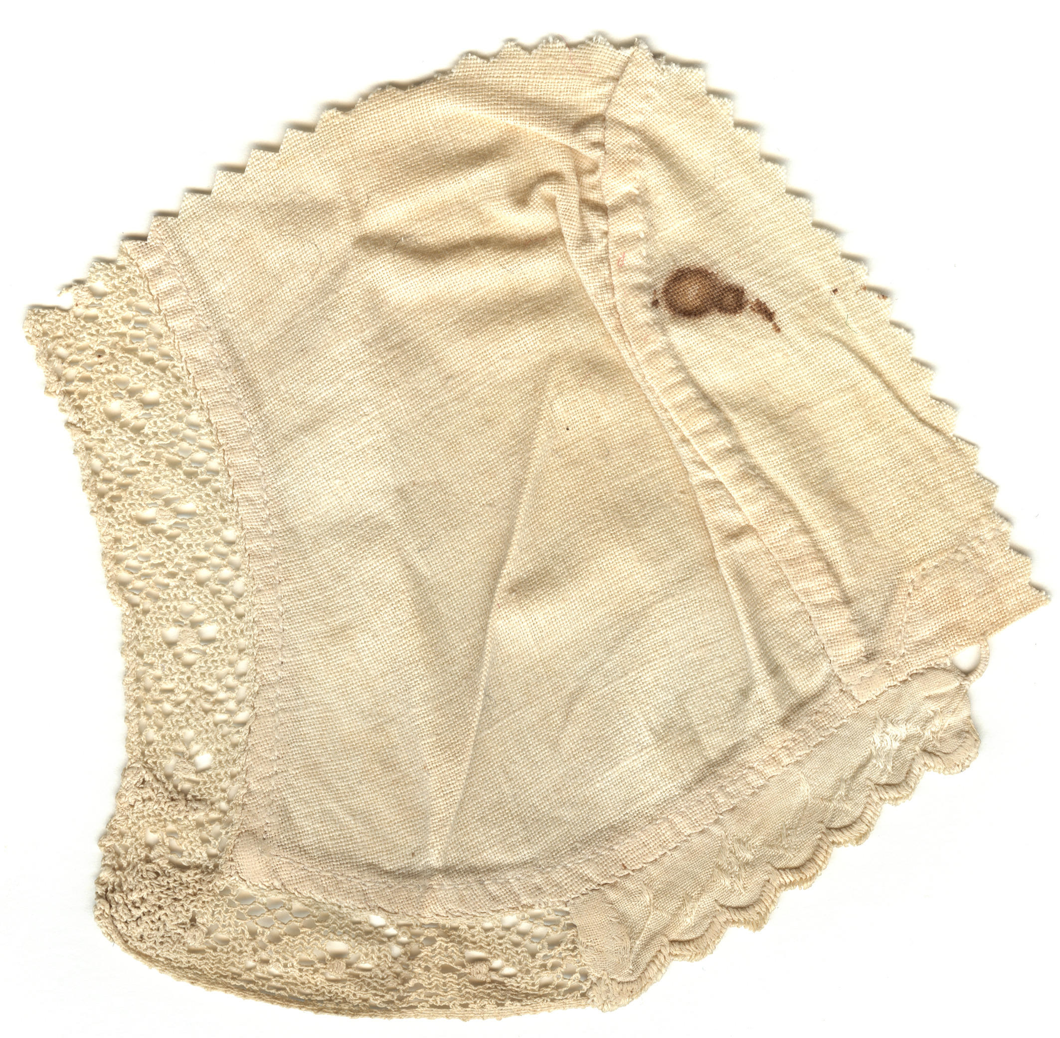 Fragment van een katoenen kindermutsje van het eiland Marken. Het mutsje is langs de voorrand afgewerkt met een strook machinale kant van circa 1,8 centimeter breed, met een rapport van circa 1,5 centimeter.