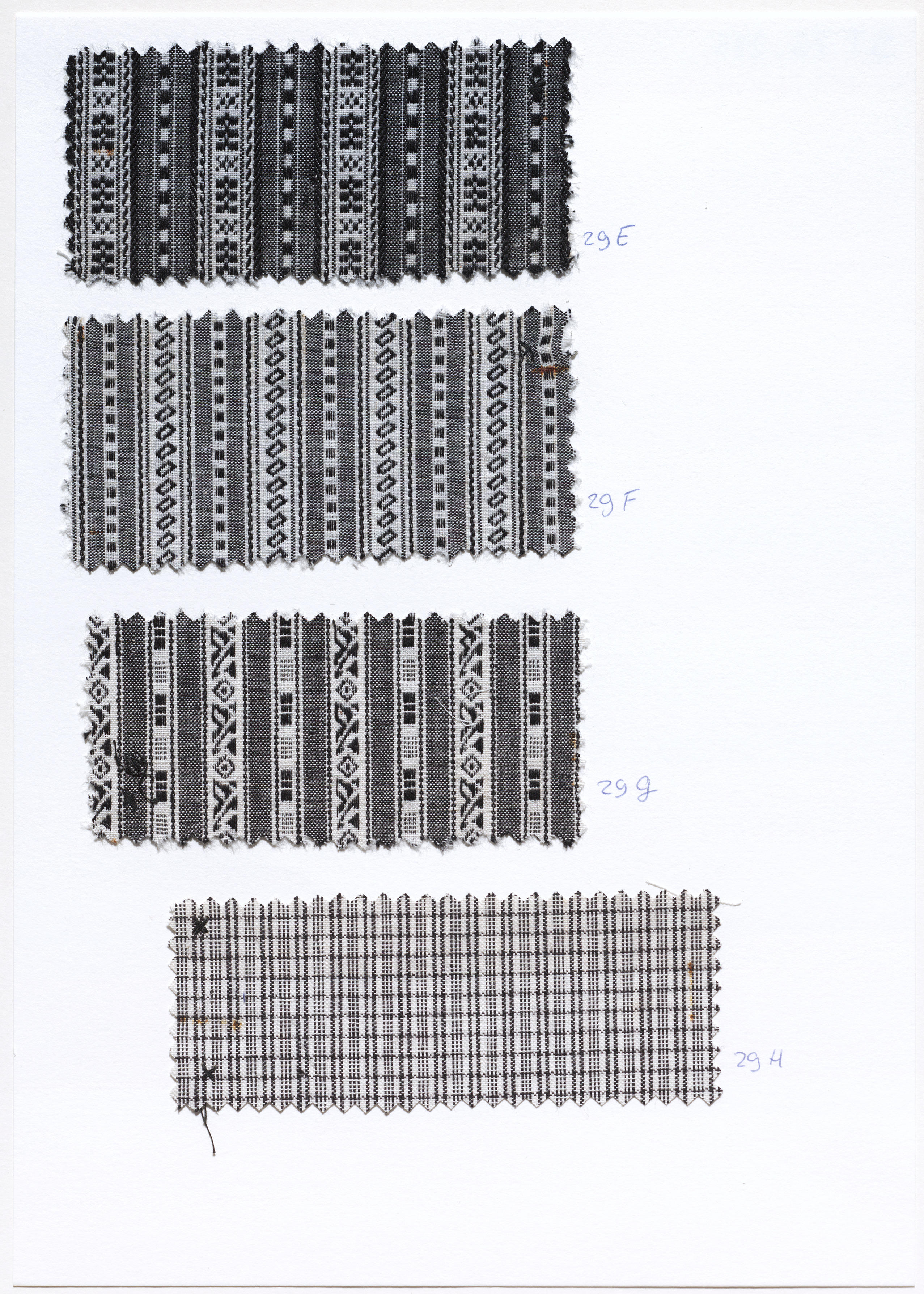 Blad met vier soorten katoenen schortenstof van witte kettingdraden met zwarte en witte inslagdraden, in patroon geweven. De stof werd gedragen in Scheveningen bij de doordeweekse opknapdracht.