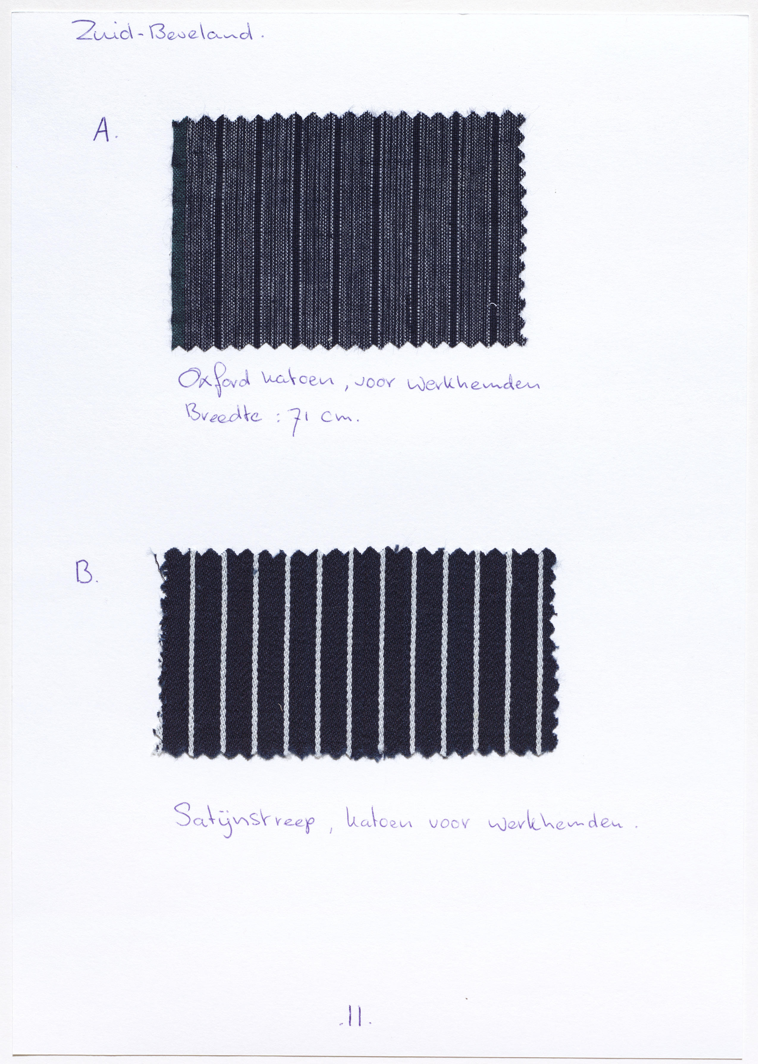 Blad met twee soorten gestreepte katoenen stof voor werkhemden, zogenaamd 'Oxford' en 'Satijnstreep'.