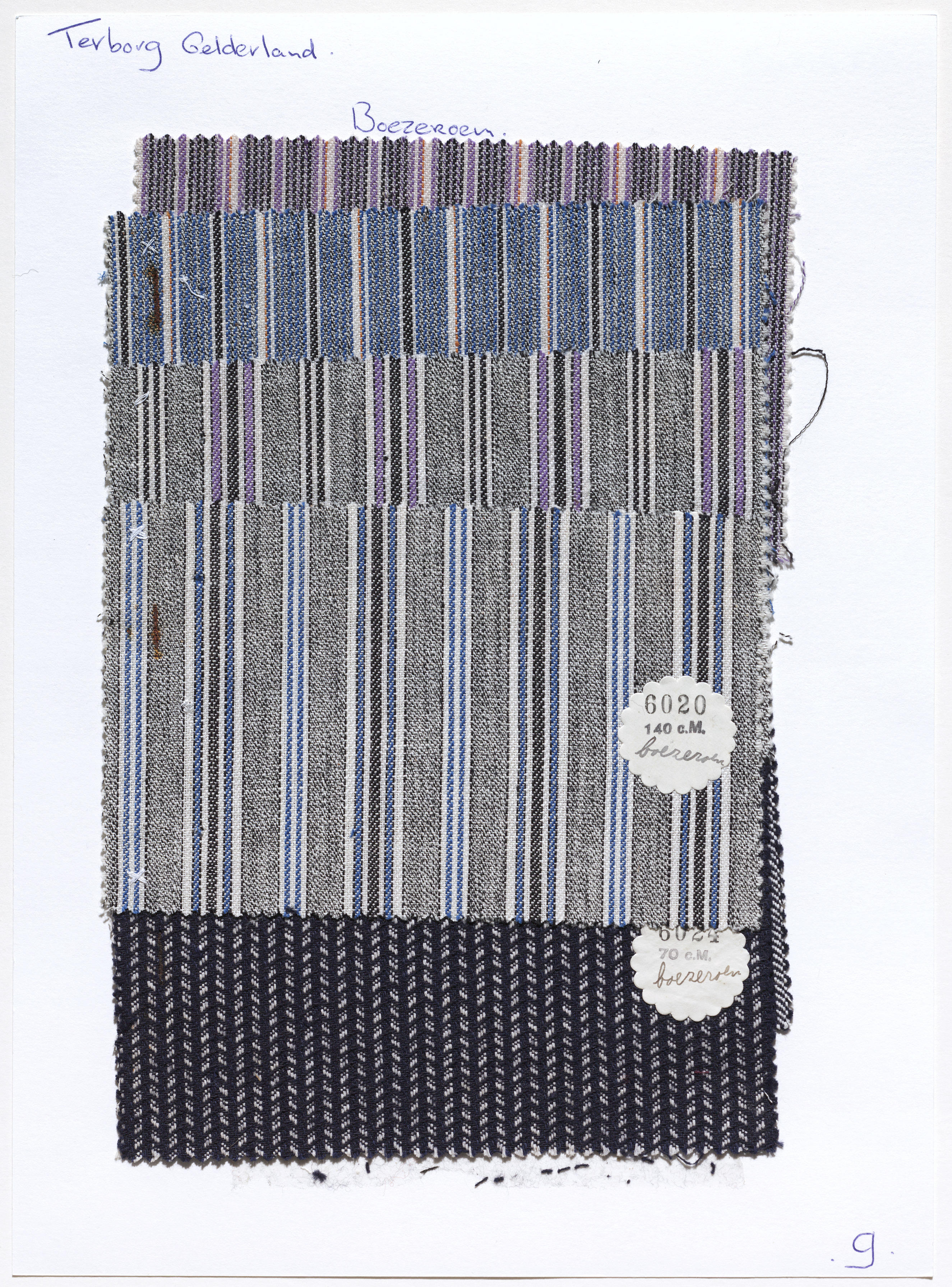 Blad met zes soorten katoenen stof, gebruikt voor boezeroenen door mannen in streekdracht uit Terborg.