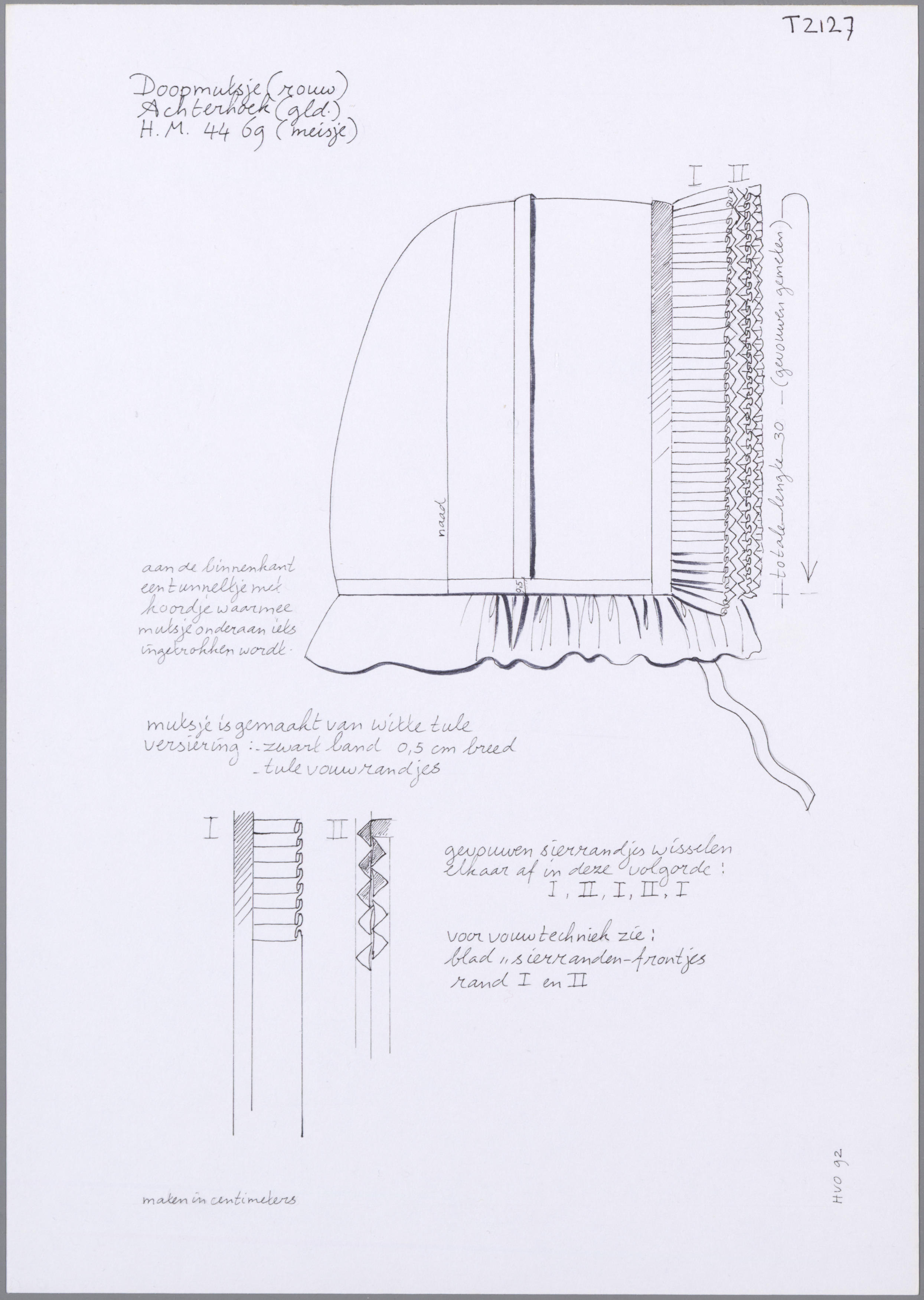 Tekening van een doopmutsje voor in de rouw, gedragen bij streekdracht uit de Achterhoek.