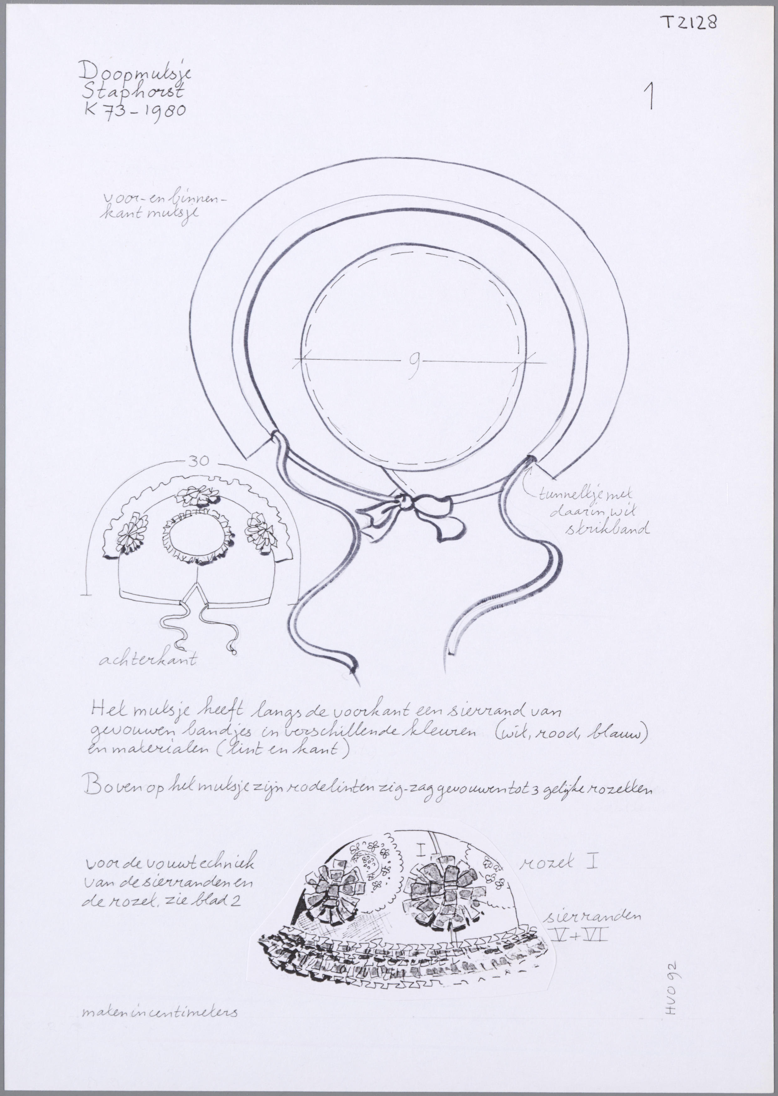 Tekening van een doopmutsje, gedragen bij streekdracht uit Staphorst.