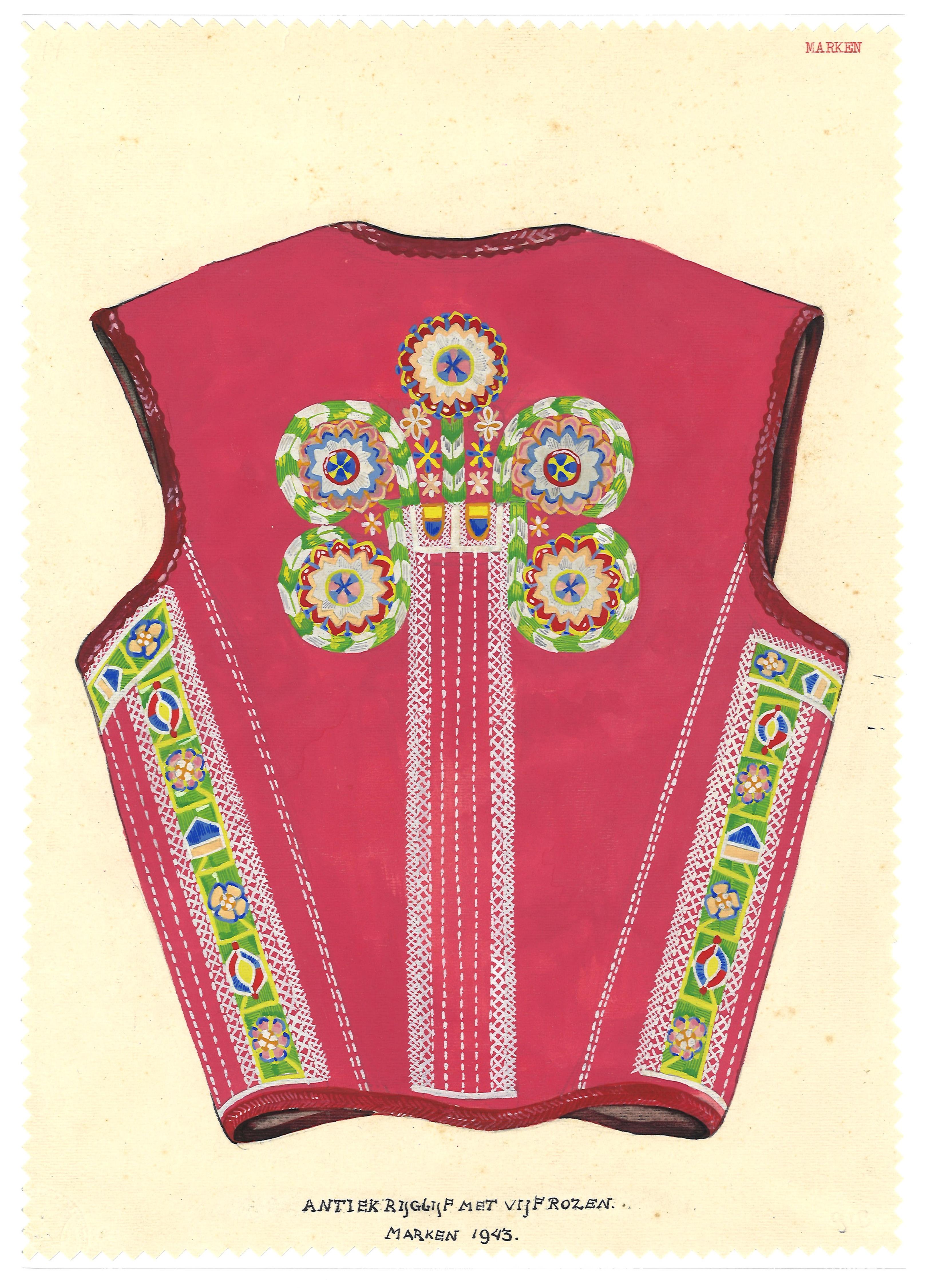 Waterverftekening van de achterzijde van een antiek rijglijf met vijf geborduurde rozen, gedragen door een meisje of vrouw in streekdracht van Marken bij de Pinksterdracht. De aquarel is vervaardigd door museummedewerkers tijdens veldwerk op Marken.