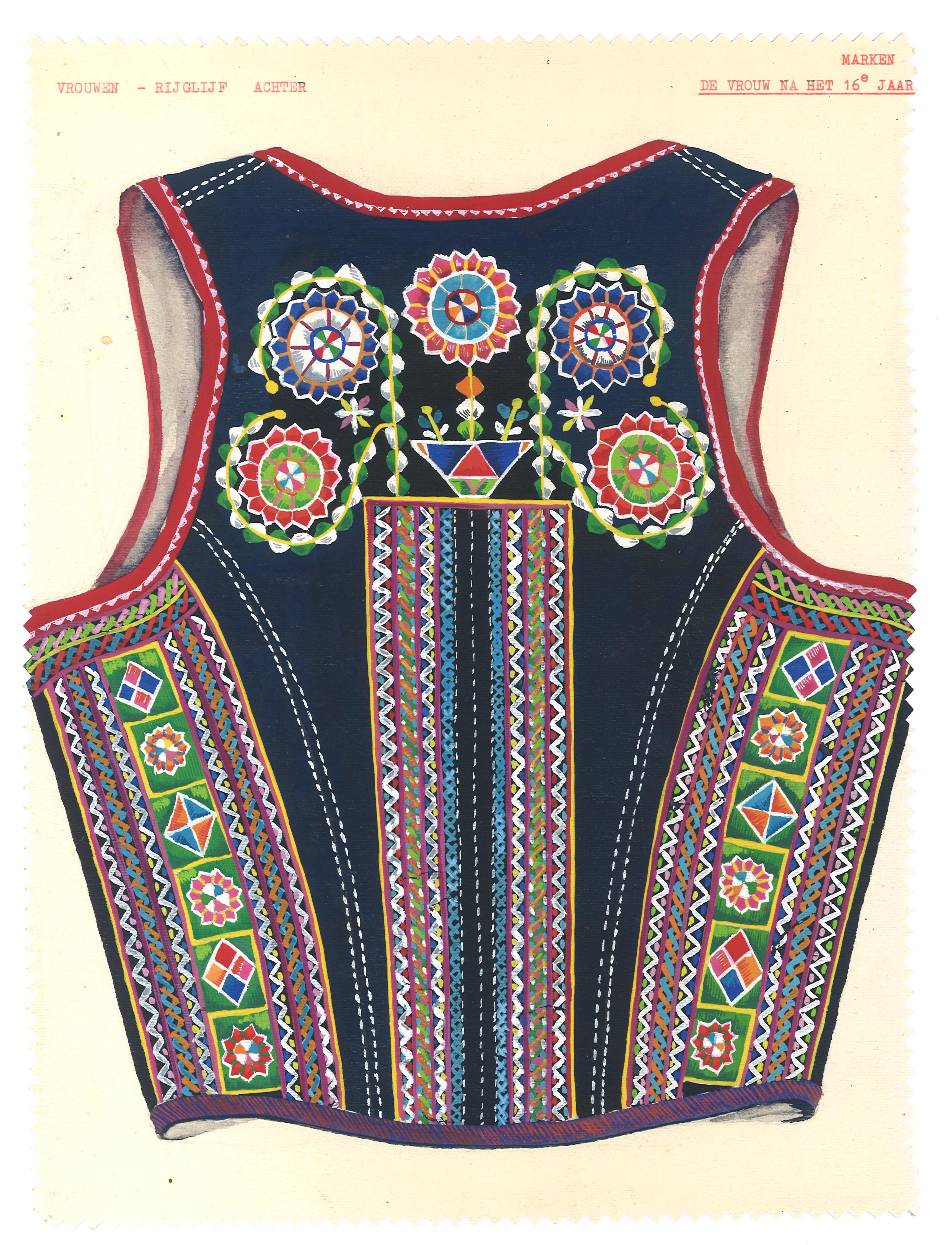 Waterverfschildering van de achterkant van een rijglijf voor een vrouw in streekdracht van het eiland Marken.