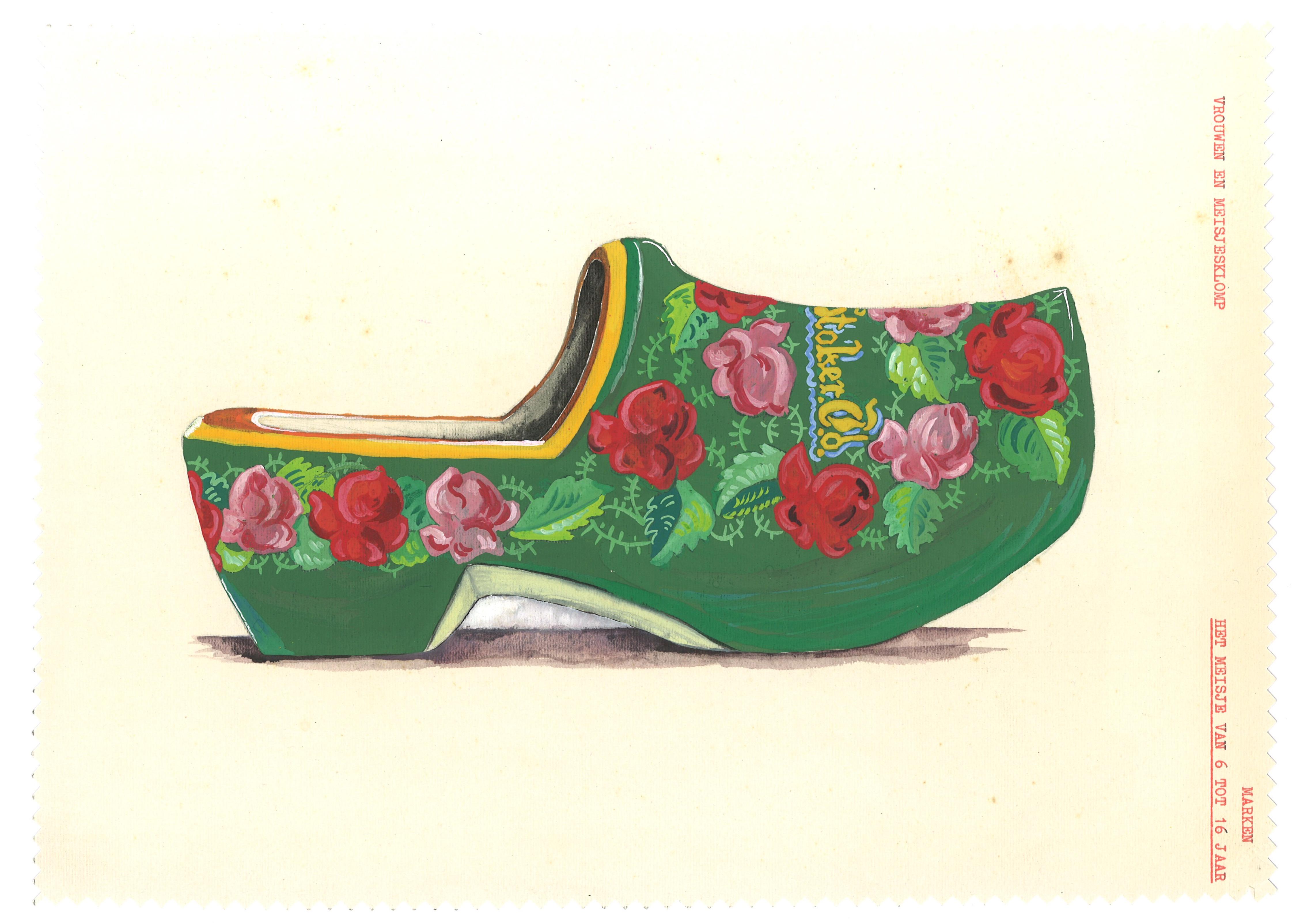 Waterverfschildering van het zijaanzicht van een beschilderde meisjesklomp, gedragen door een meisje in streekdracht van het eiland Marken.