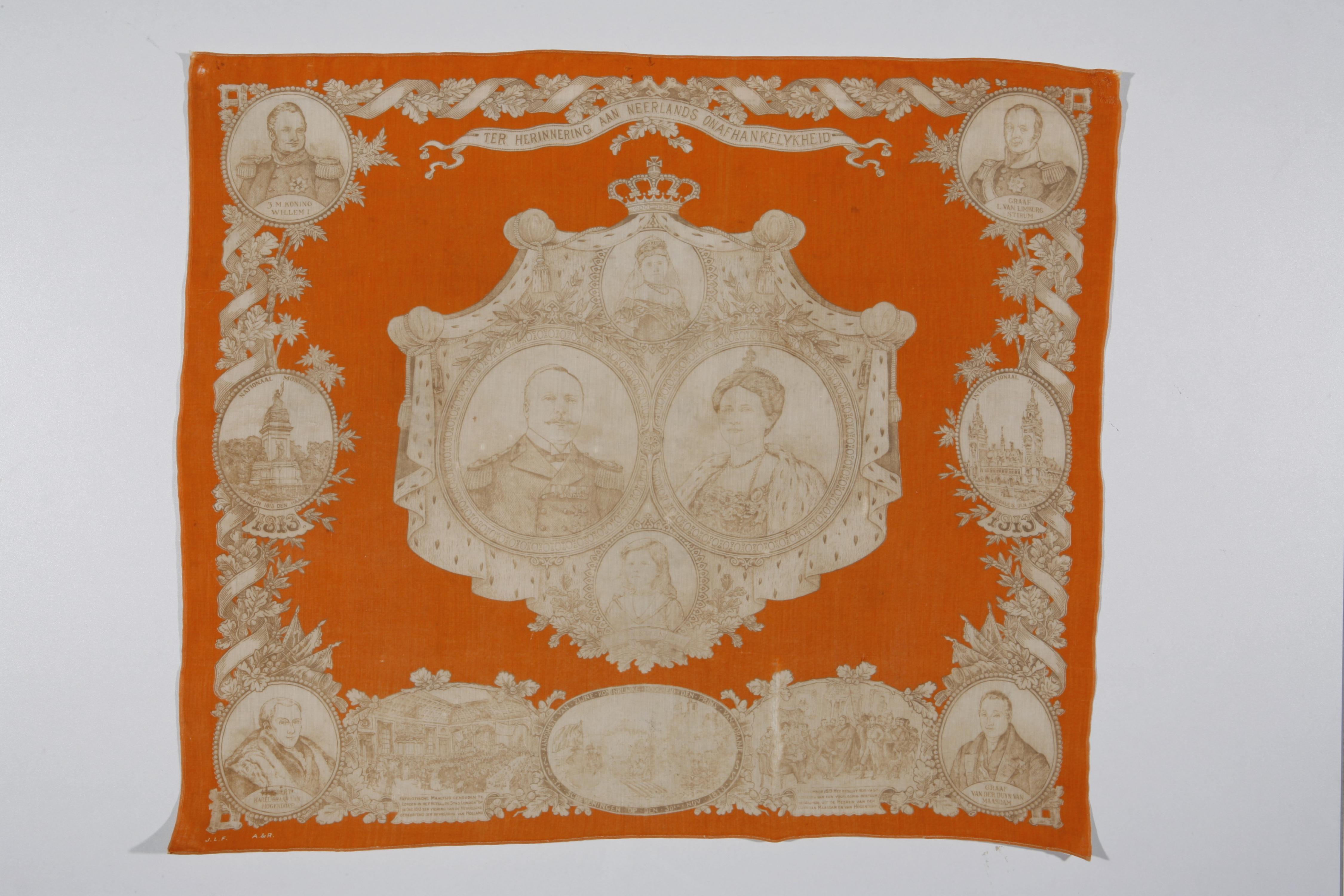 Deze oranjedoek uit Marken is gemaakt ter herinnering aan honderd jaar Nederlandse Onafhankelijkheid (1813-1913). Het doek heeft als hoofdthema de portretten van koningin Wilhelmina (1880-1962), prins Hendrik (1876-1934), koningin-moeder Emma (1858-1934) en prinses Juliana (1909-2004). Het Vredespaleis in Den Haag dat in 1913 officieel is geopend staat ook op deze doek afgebeeld. In de rand ...