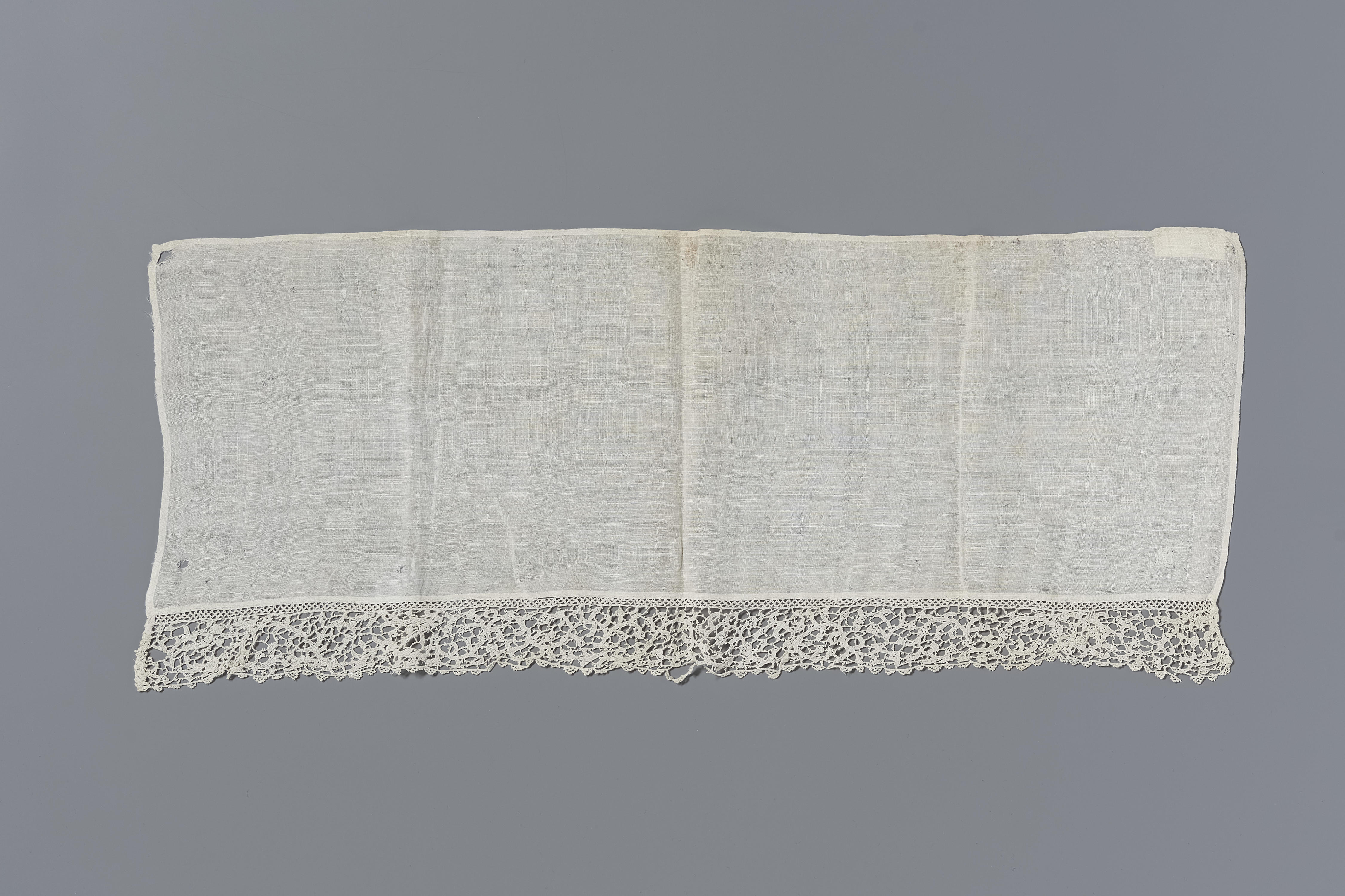 Kastplankdoek, afgewerkt met een strook Venise plat (naaldkant) uit het laatste kwart van de zeventiende eeuw. Aan de bovenzijde van de kantstrook is een zogenoemde angrelure gezet.