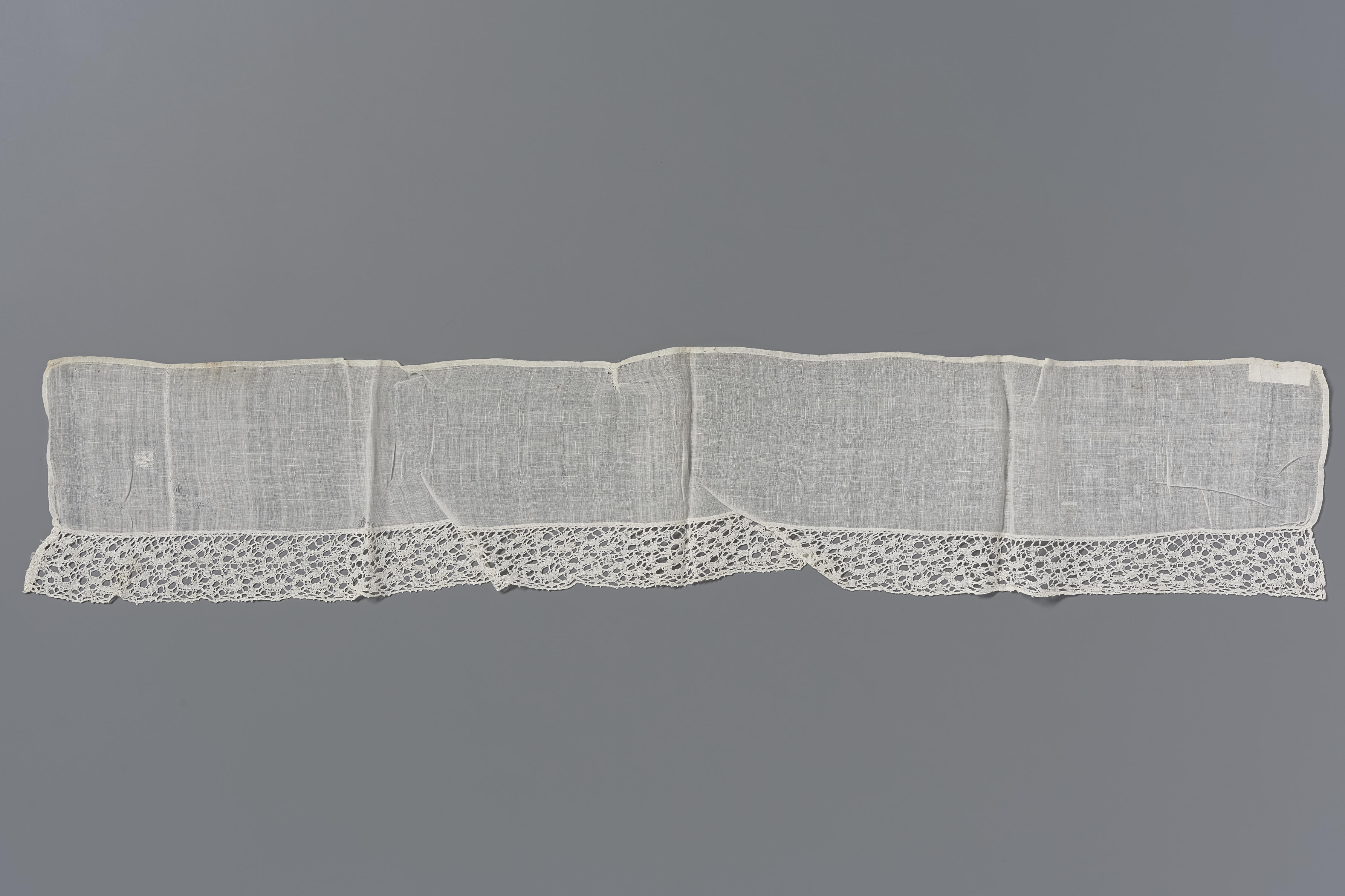 Linnen kastplankdoek, afgezet met Vlaamse kloskant uit het begin van de achttiende eeuw.