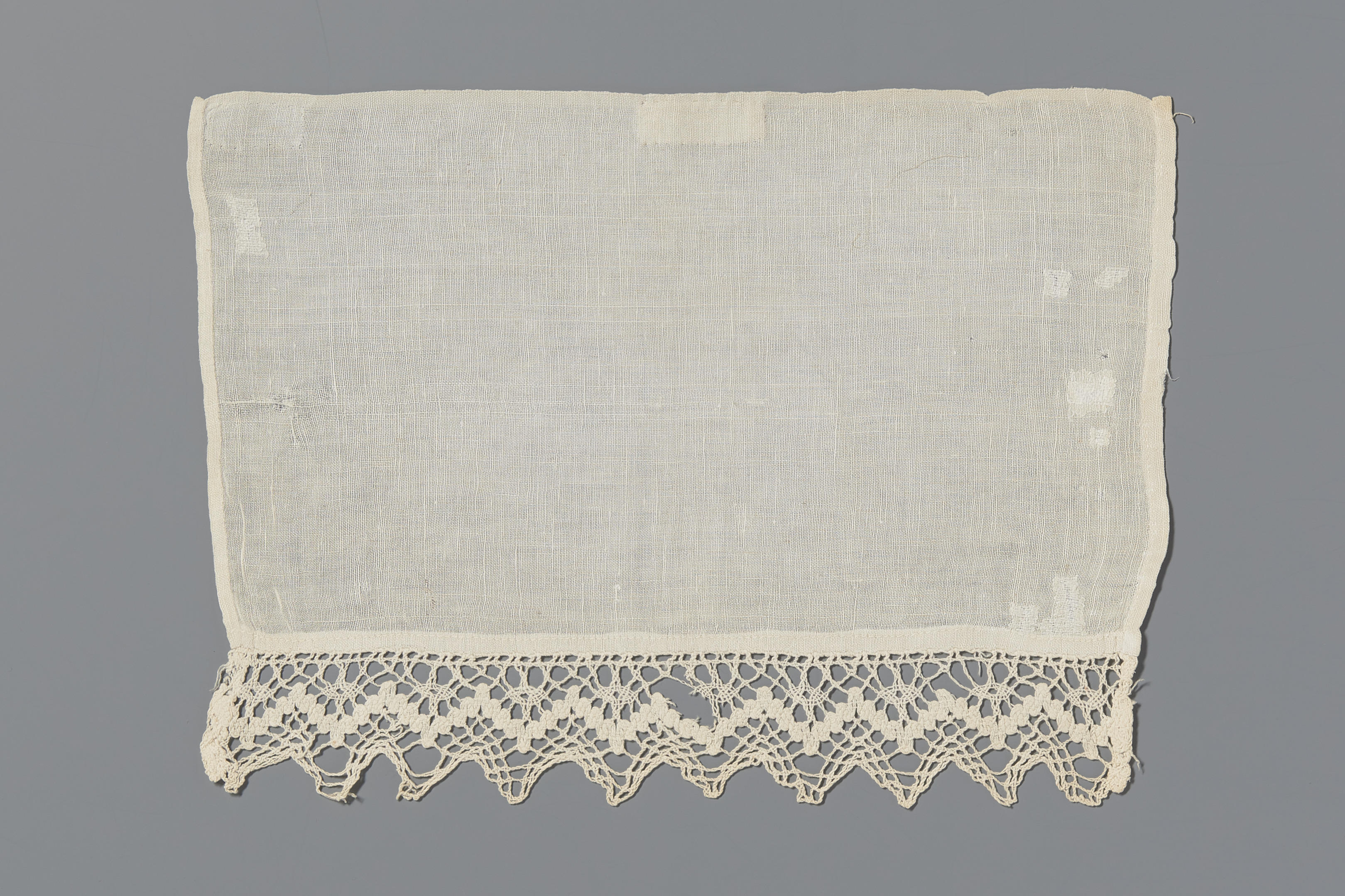 Rechthoekig kleedje, een zogenoemd spreitje. Het spreitje is gemaakt van witte katoen, afgezet met een strook machinale kant. Dergelijke kleedjes werden op Marken tussen de opgestapelde spanen dozen gelegd, waarbij de kantstrook aan de voorzijde afhing.