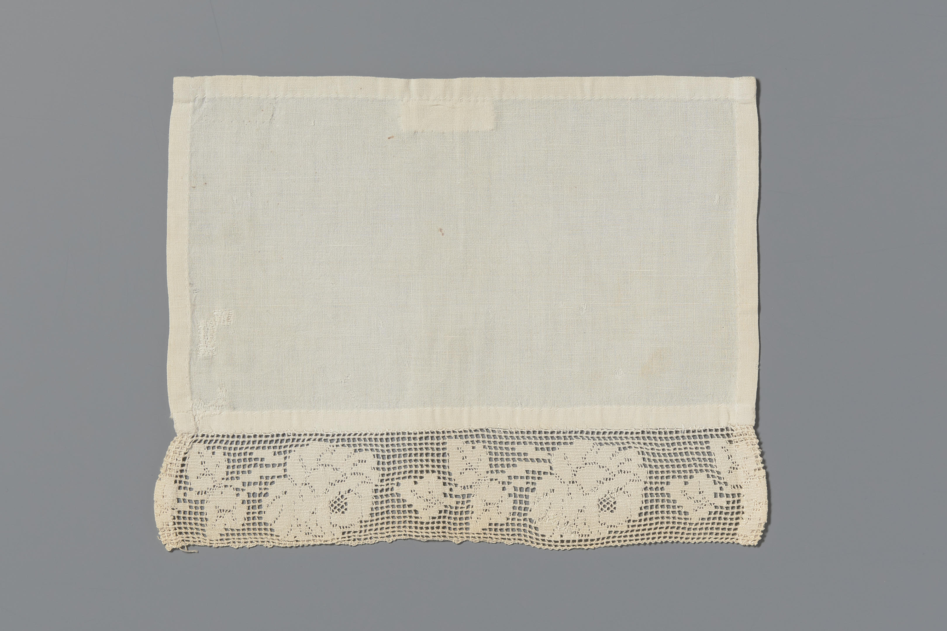 Rechthoekig kleedje, een zogenoemd spreitje. Het spreitje is gemaakt van witte katoen, afgezet met een strook machinale kant. Dergelijke kleedjes werden op Marken tussen de opgestapelde spanen dozen gelegd, waarbij de kantstrook aan de voorzijde afhing.