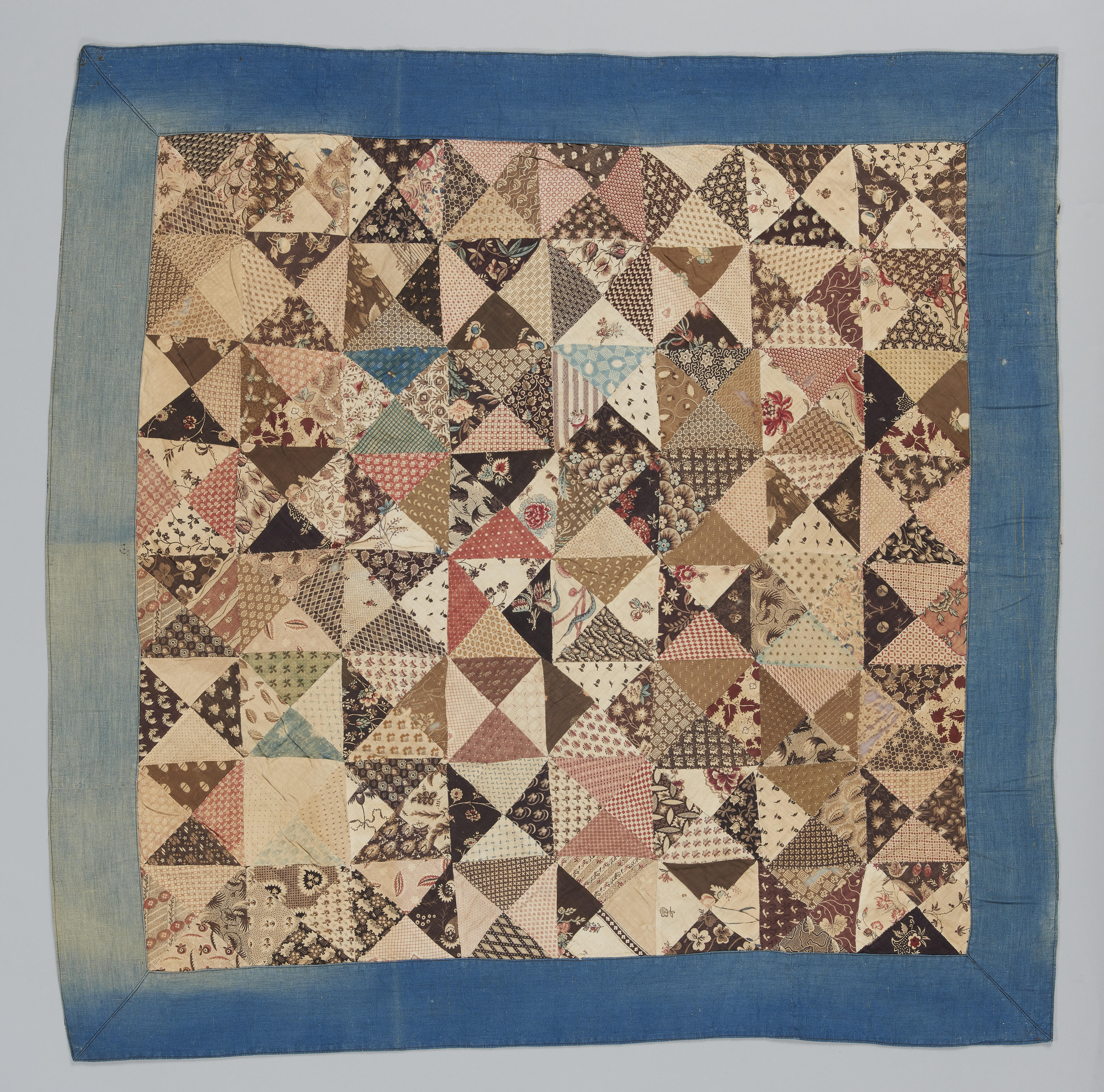 Lappendeken, samengesteld uit driehoekige lapjes die per vier een vierkant vormen. De katoenen lapjes hebben verschillende printjes. Om de vierkanten heen is een blauwe rand van linnen van ongeveer 10 centimeter breed aangebracht. De achterzijde van de rand is van zwartblauw geruite stof met een wit draadje.