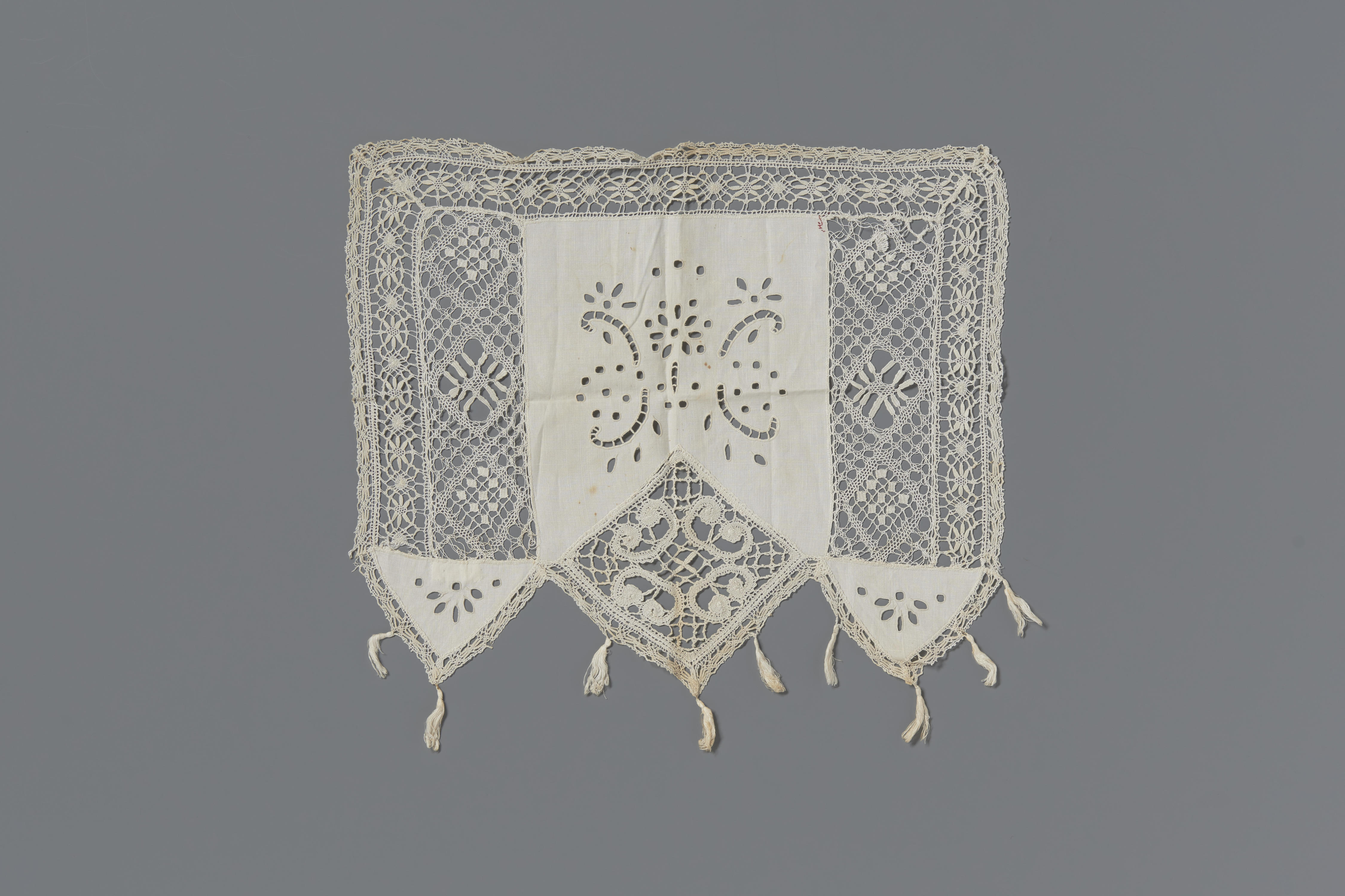 Zogenoemde antimakassar, gebruikt om rug- en armleuningen van gestoffeerde meubels te beschermen tegen vlekken van makassarolie of andere haarverzorgingsmiddelen.