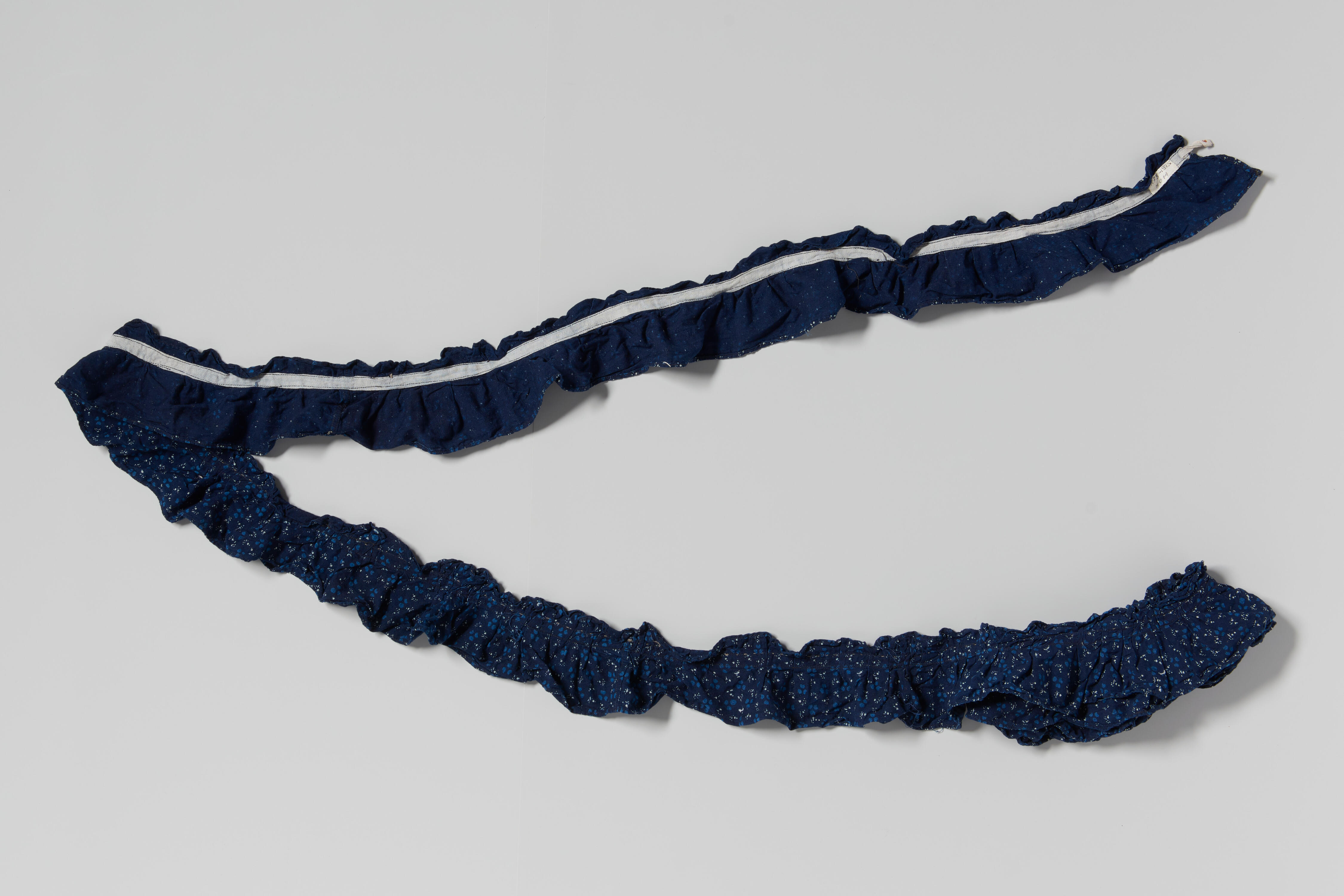 Een schoorsteenval, vervaardigd van katoen en bedrukt met indigo in blauwdruktechniek. Het dessin bestaat uit witte en lichtblauwe motieven op een donkerblauw fond. De stof is gerimpeld tegen een wit katoenen keperband gezet. Deze schoorsteenval is bij verwerving door het museum toegeschreven aan Spakenburg, maar daar kwamen dergelijke vallen niet voor. Waarschijnlijk komt de val ...