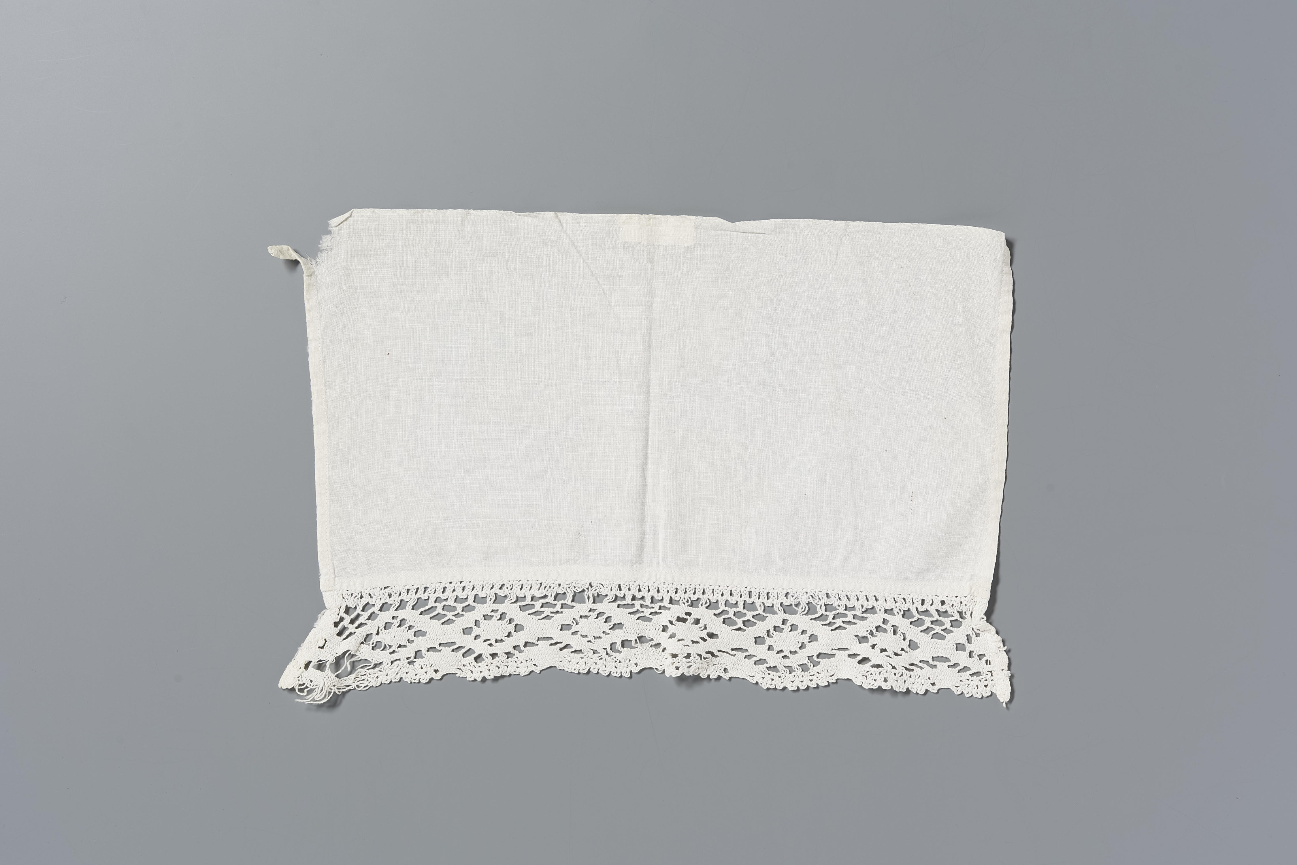 Rechthoekig kleedje, een zogenoemd spreitje. Het spreitje is gemaakt van witte katoen, afgezet met een strook machinale kant. Dergelijke kleedjes werden op Marken tussen de opgestapelde spanen dozen gelegd, waarbij de kantstrook aan de voorzijde afhing.