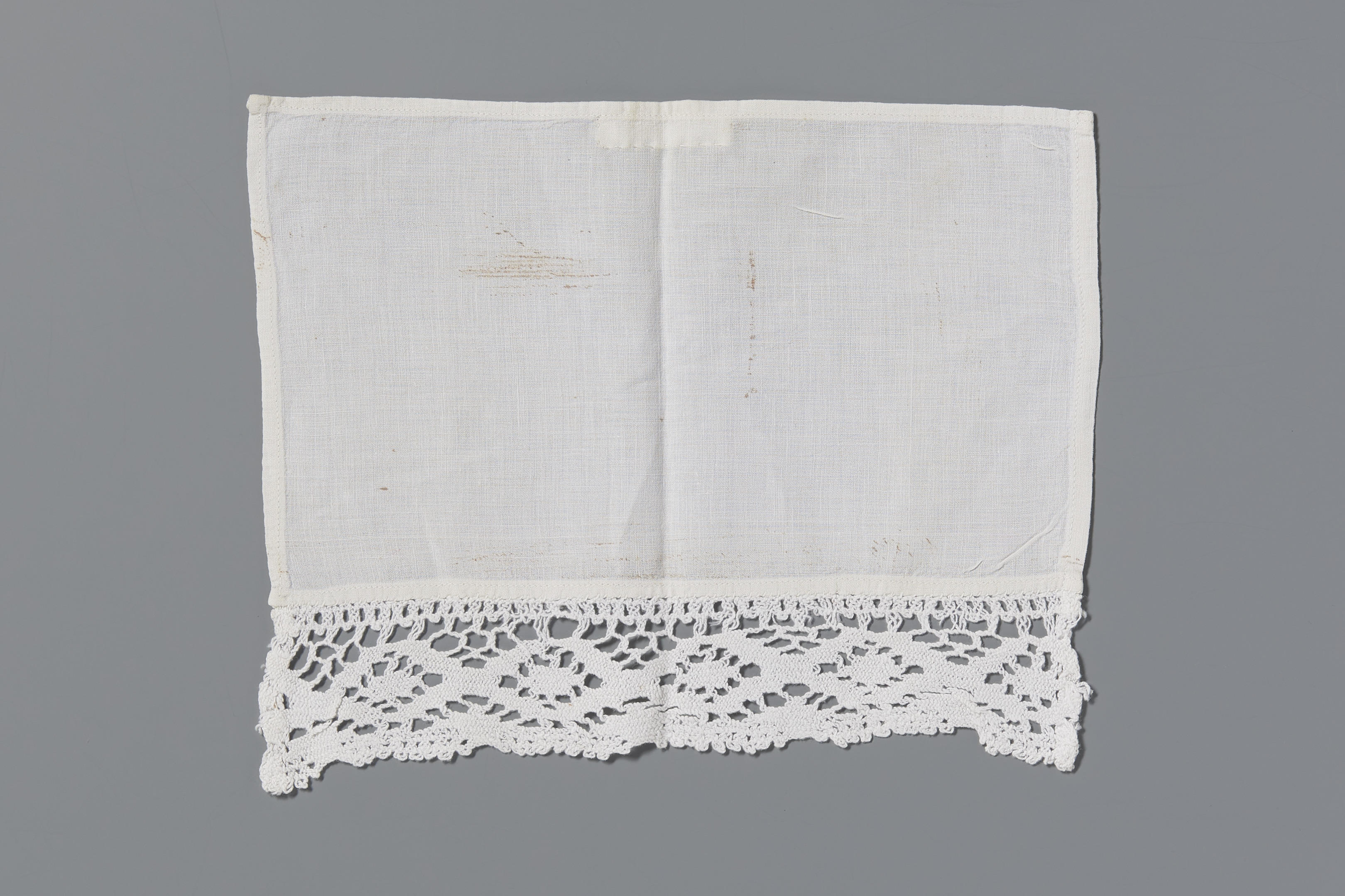 Rechthoekig kleedje, een zogenoemd spreitje. Het spreitje is gemaakt van witte katoen, afgezet met een strook machinale kant. Dergelijke kleedjes werden op Marken tussen de opgestapelde spanen dozen gelegd, waarbij de kantstrook aan de voorzijde afhing.