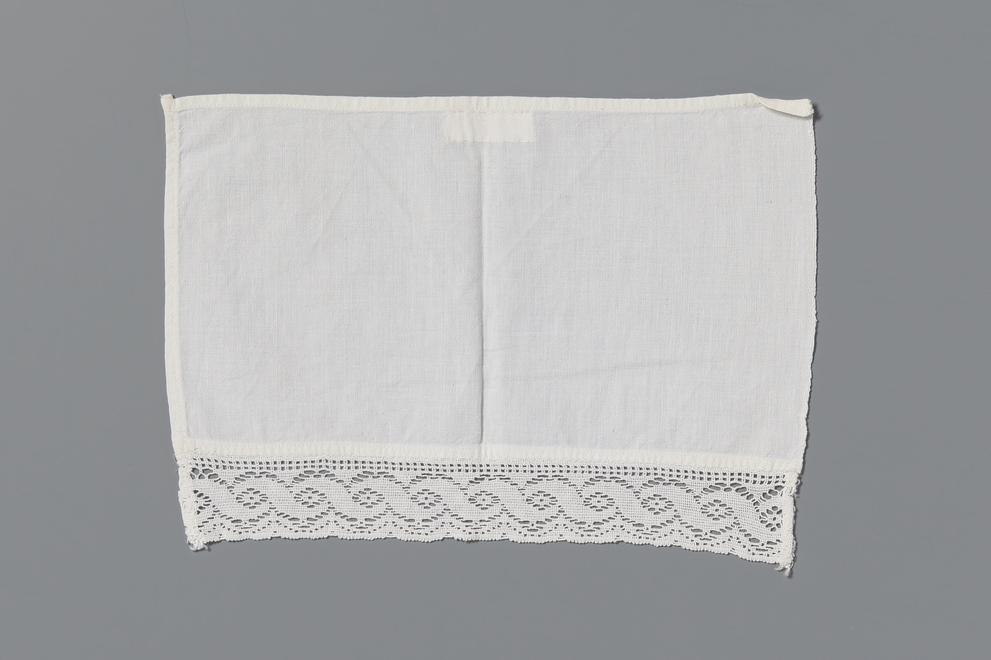 Rechthoekig kleedje, een zogenoemd spreitje. Het spreitje is gemaakt van witte katoen, afgezet met een strook machinale kant. Dergelijke kleedjes werden op Marken tussen de opgestapelde spanen dozen gelegd, waarbij de kantstrook aan de voorzijde afhing.