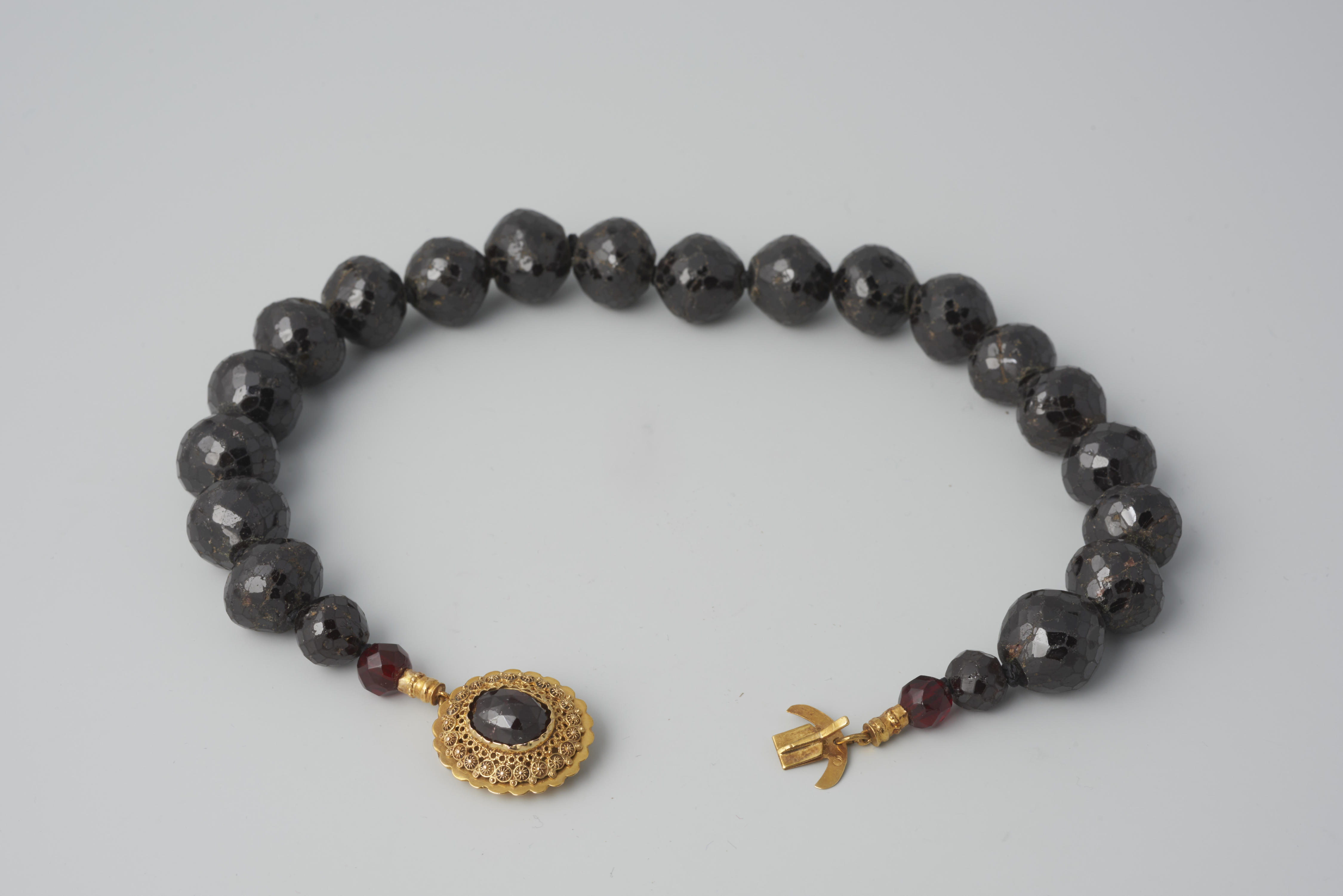 Granaten halssnoer met 14-karaats gouden knipslot, gedragen door een vrouw uit de provincie Friesland. De vervaardiger is onbekend. In het slot staat een gehaltemerk dat gebruikt is tussen 1853 en 1906.