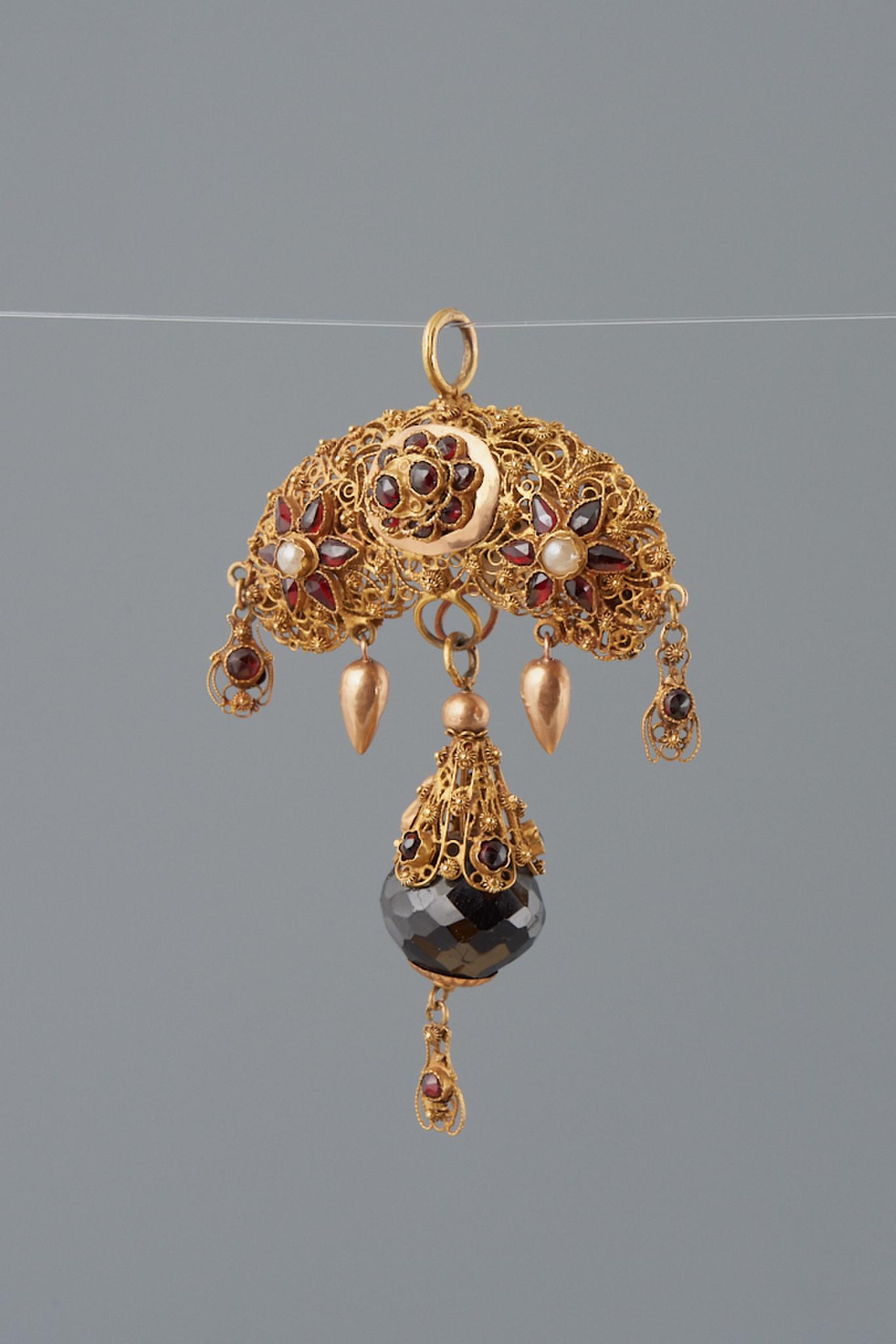 Een paar oorijzerhangers van goud met granaat en parels, gedragen aan de krullen van het oorijzer door een meisje of vrouw in streekdracht van Noord-Beveland. Dit type oorijzerhangers werd op Noord-Beveland klokkenbellen genoemd. De hangers zijn waarschijnlijk vervaardigd omstreeks 1860.