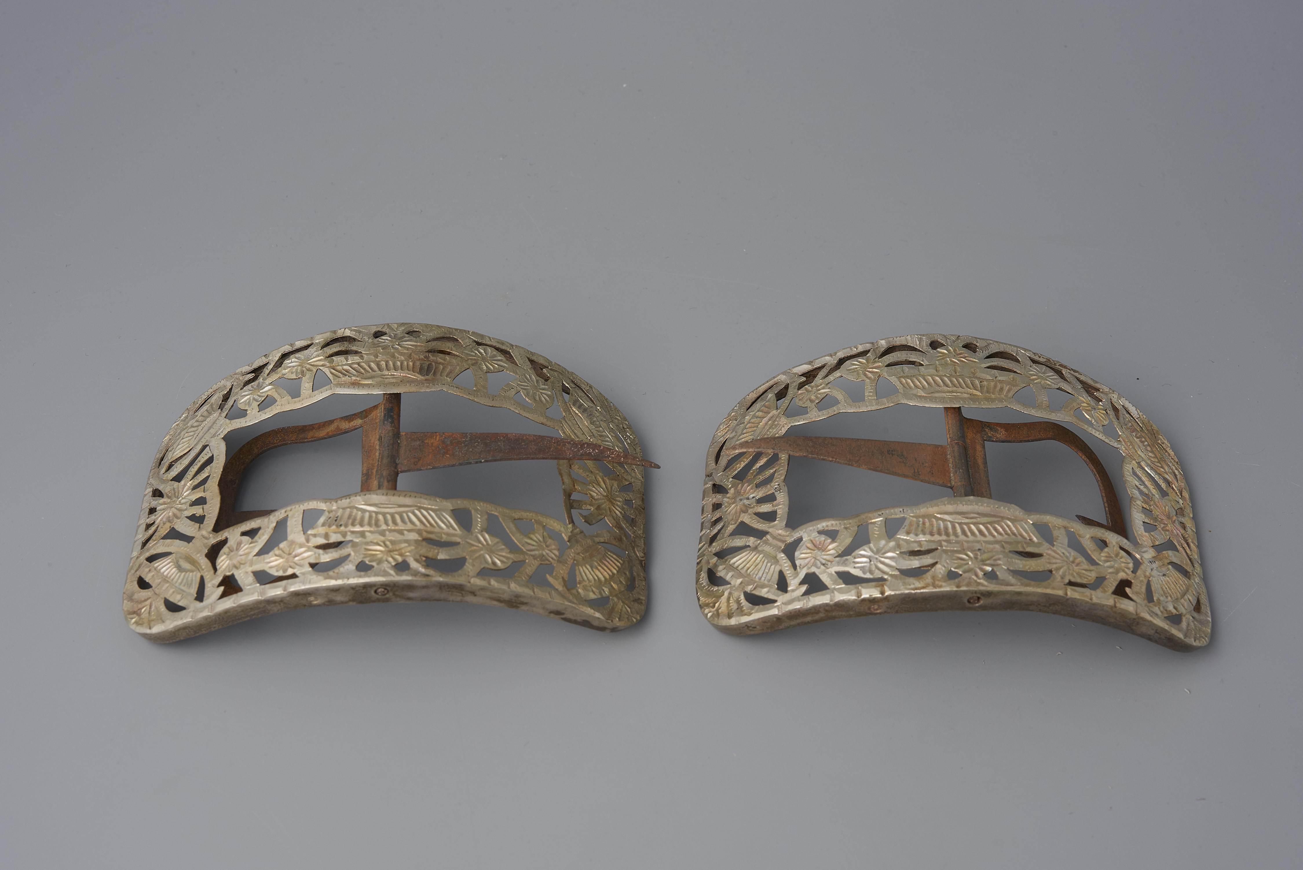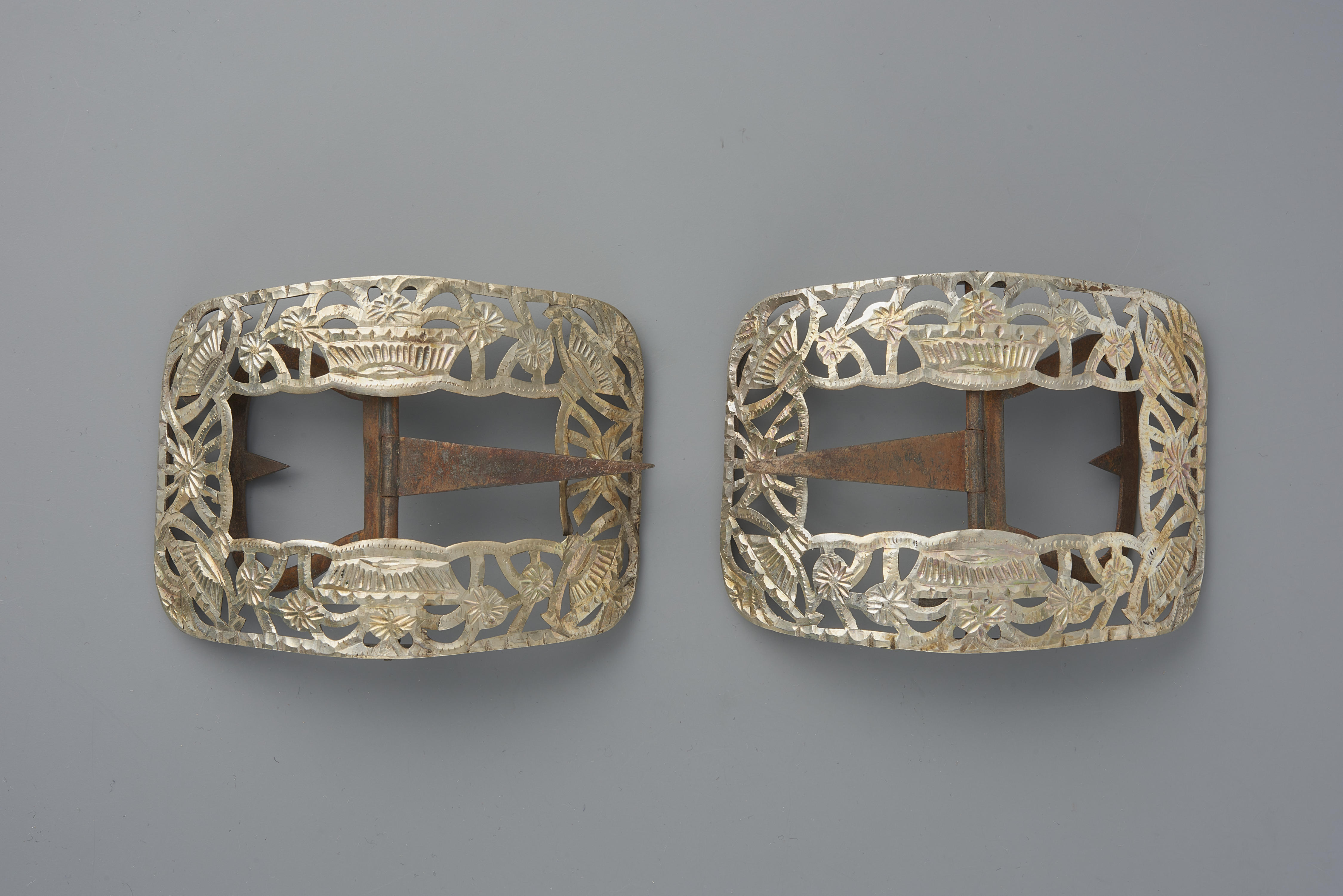 Paar zilveren schoengespen, gedragen door een vrouw of meisje uit Bunschoten. De gespen hebben een jaarletter uit 1927.