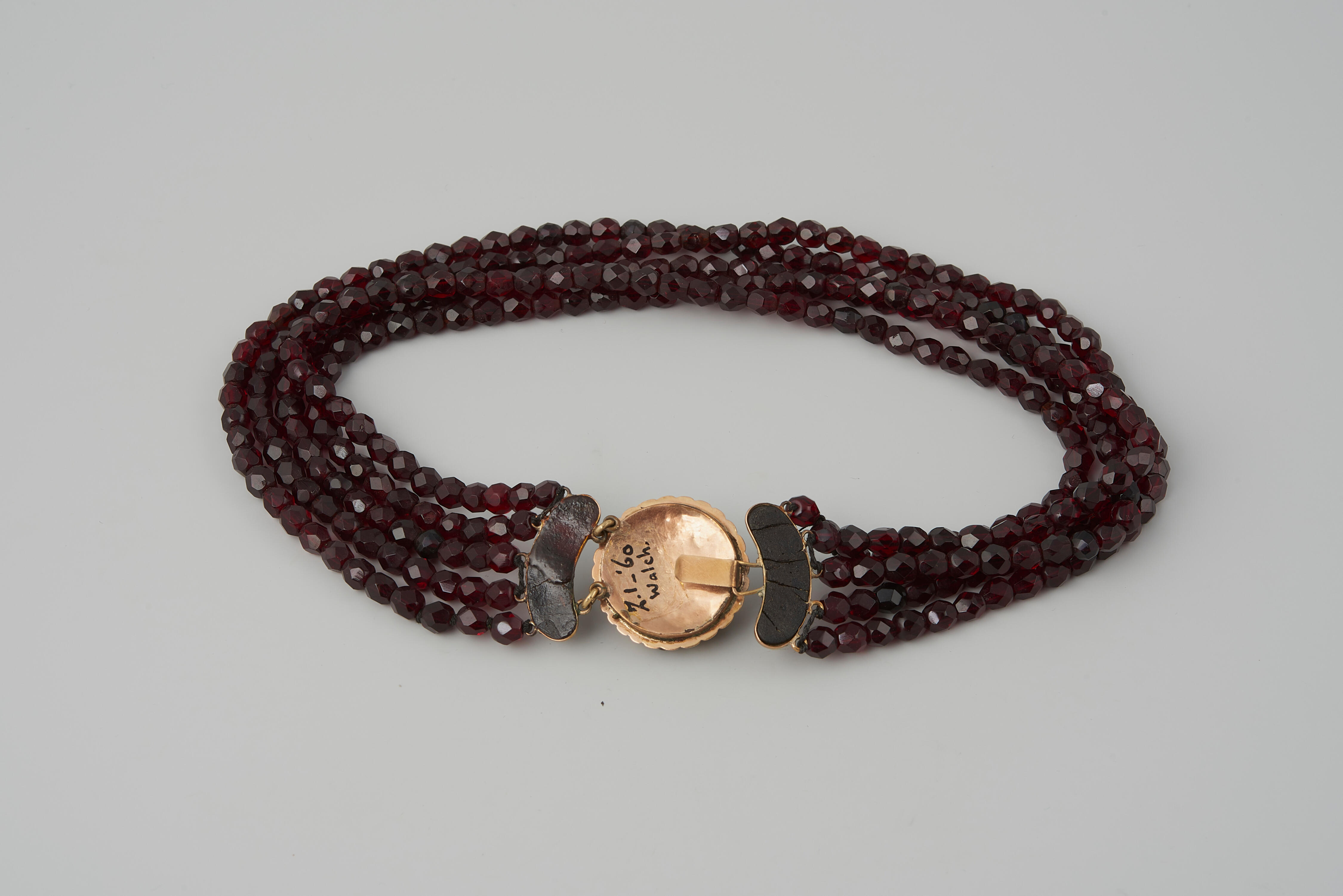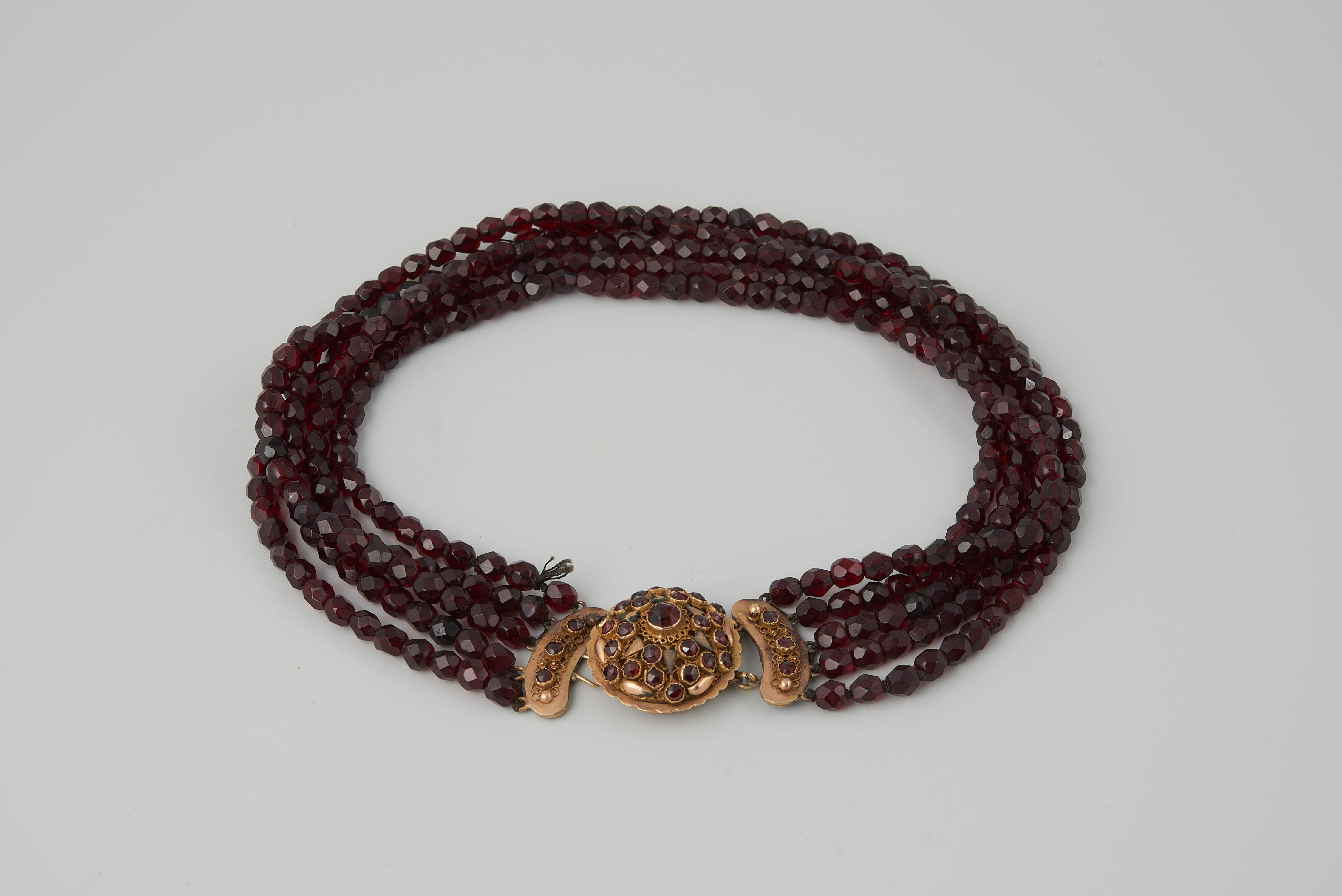 Een driedelig gouden halssnoerslot, ingelegd met granaat. Het halssnoerslot is gedragen door een meisje of vrouw in streekdracht van Walcheren. De vervaardiger van het slot is onbekend, want er zijn geen merken aangetroffen. In 1960 is het slot in het museum voorzien van vier strengen kralen van imitatiegranaat.