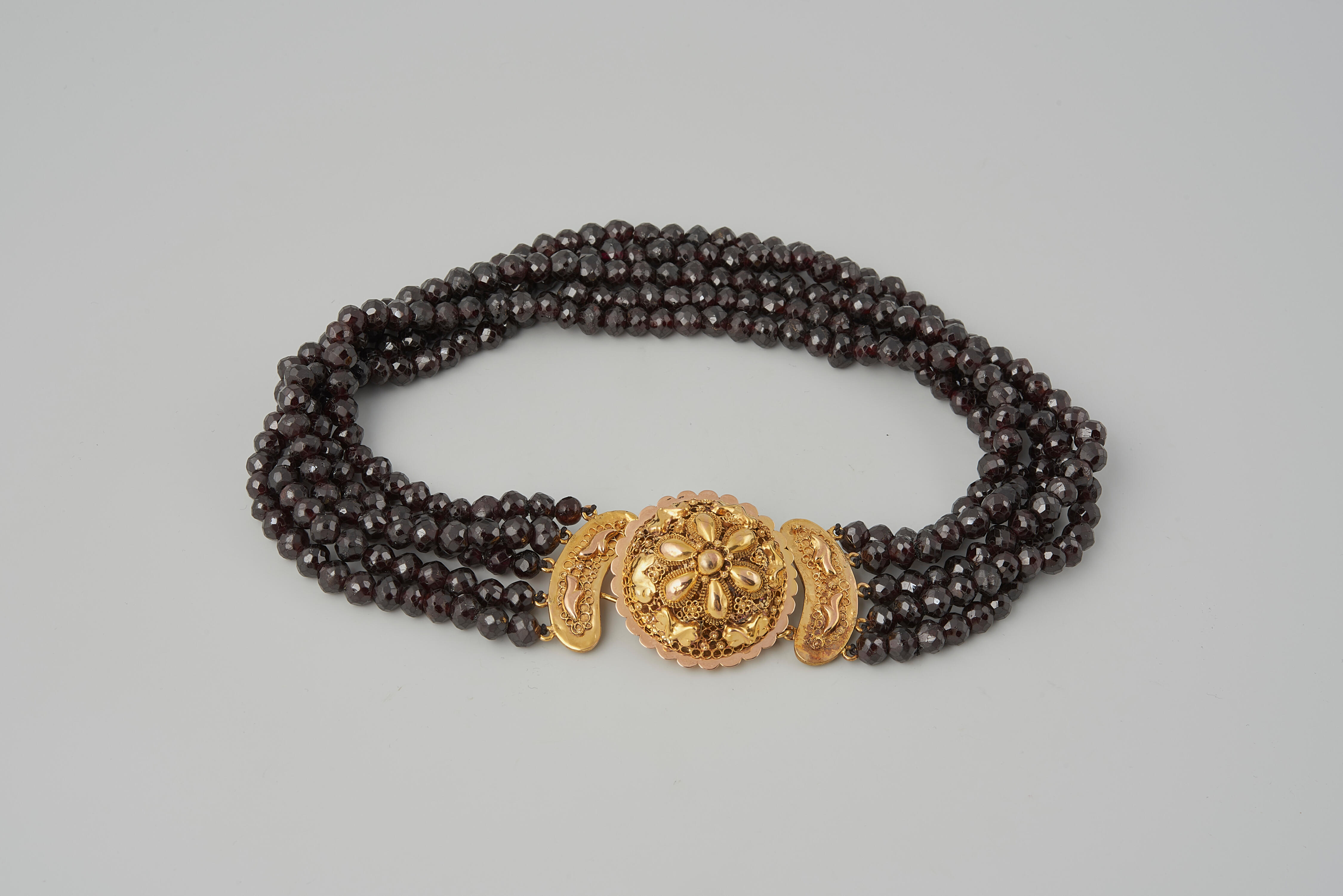 Een halssnoer, bestaande uit vijf strengen kralen van glas of granaat aan een driedelig 14-karaats gouden slot, gedragen door een vrouw in streekdracht van het eiland Walcheren.