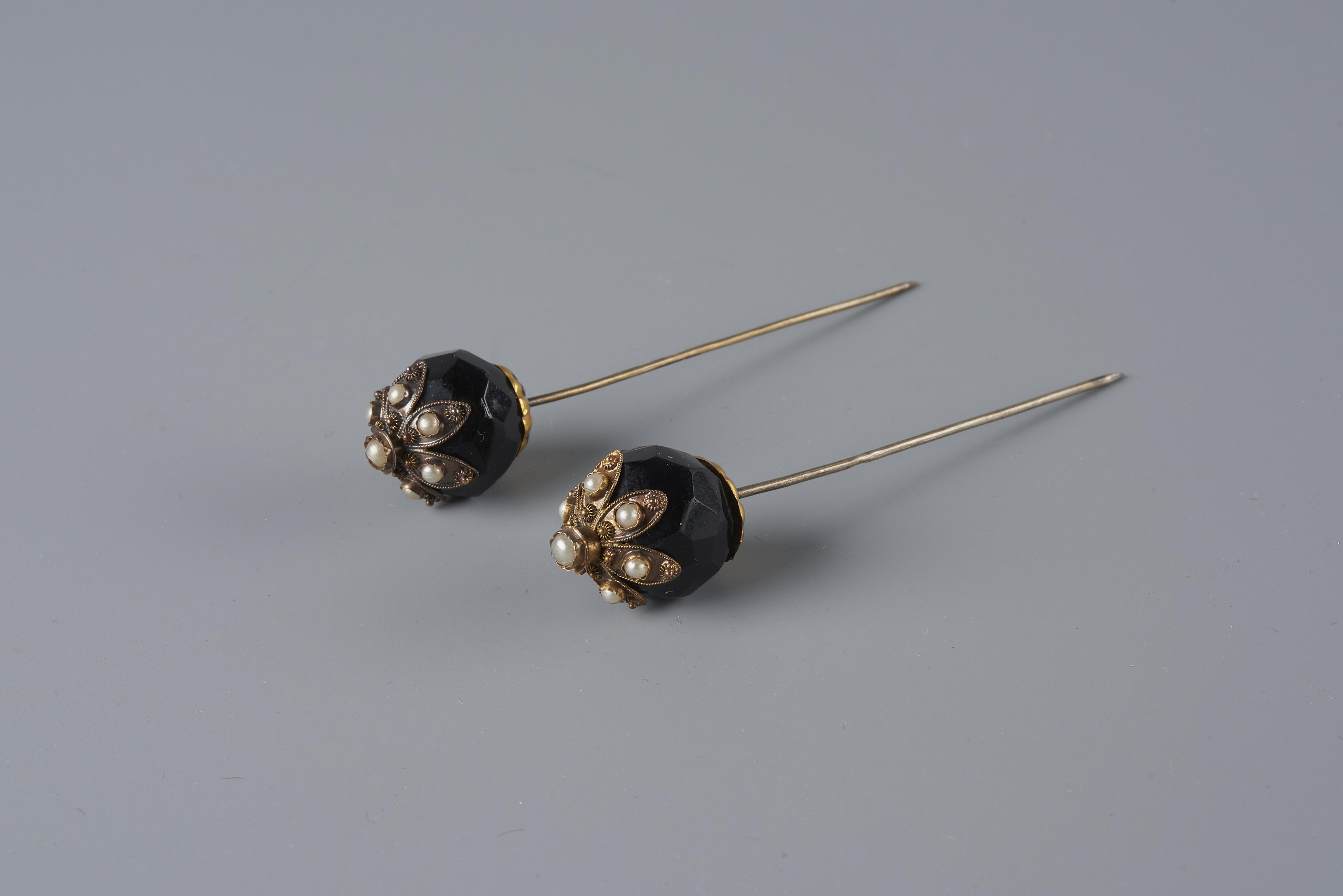 Paar mutsspelden, gedragen door een vrouw op Zuid-Beveland bij de rouwdracht. De vervaardiger is onbekend. Dit type spelden is omstreeks 1890 in de mode gekomen en gedragen tot ongeveer 1950. Deze spelden hebben een gehaltemerk dat gebruikt is vanaf 1906.