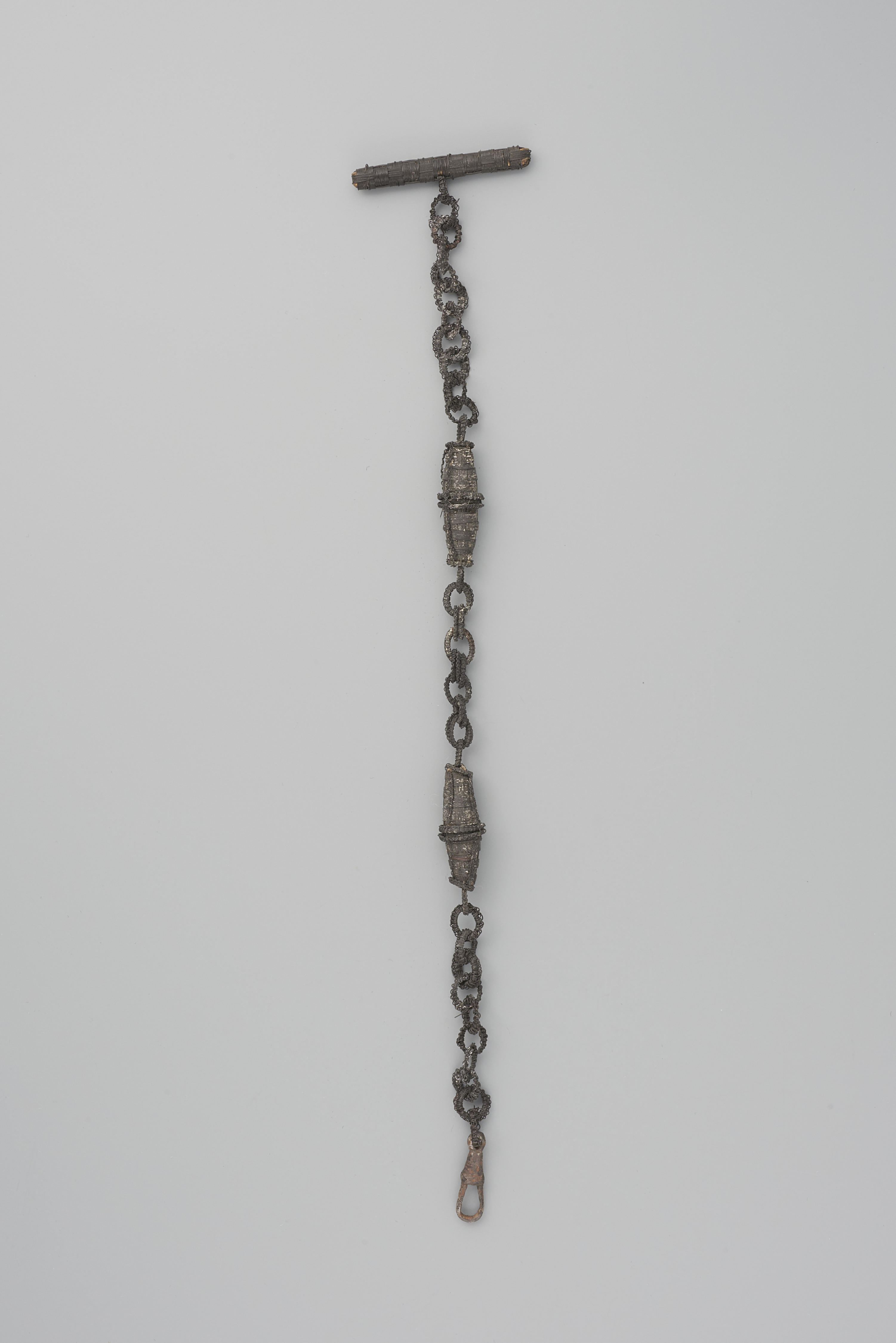 Horlogeketting, gemaakt van ringetjes en staafjes en overtrokken met gevlochten paardenhaar. Dit type horlogeketting is niet streekgebonden en kan op diverse plaatsen in Nederland gedragen zijn. Dit exemplaar dateert waarschijnlijk van omstreeks 1880.