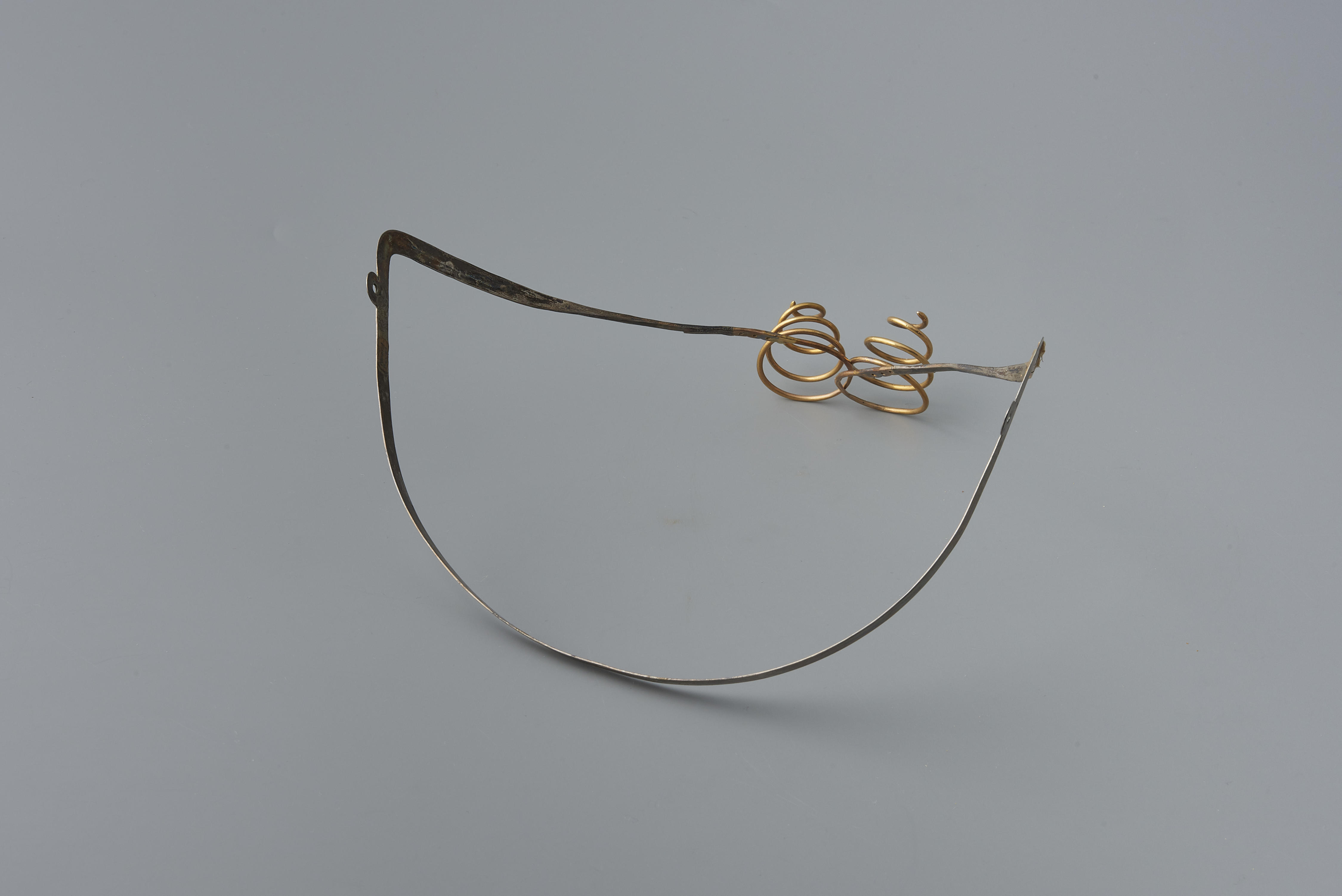 Oorijzer, bestaande uit een zilveren beugel en twee gouden krullen, gedragen door een vrouw in streekdracht van Noord-Beveland. De krullen hebben vier windingen. In de aanzet van de krullen zitten drie gaatjes. Door deze gaatjes kunnen spelden worden gestoken om het oorijzer en de muts aan elkaar vast te maken. In de beugel en de ...