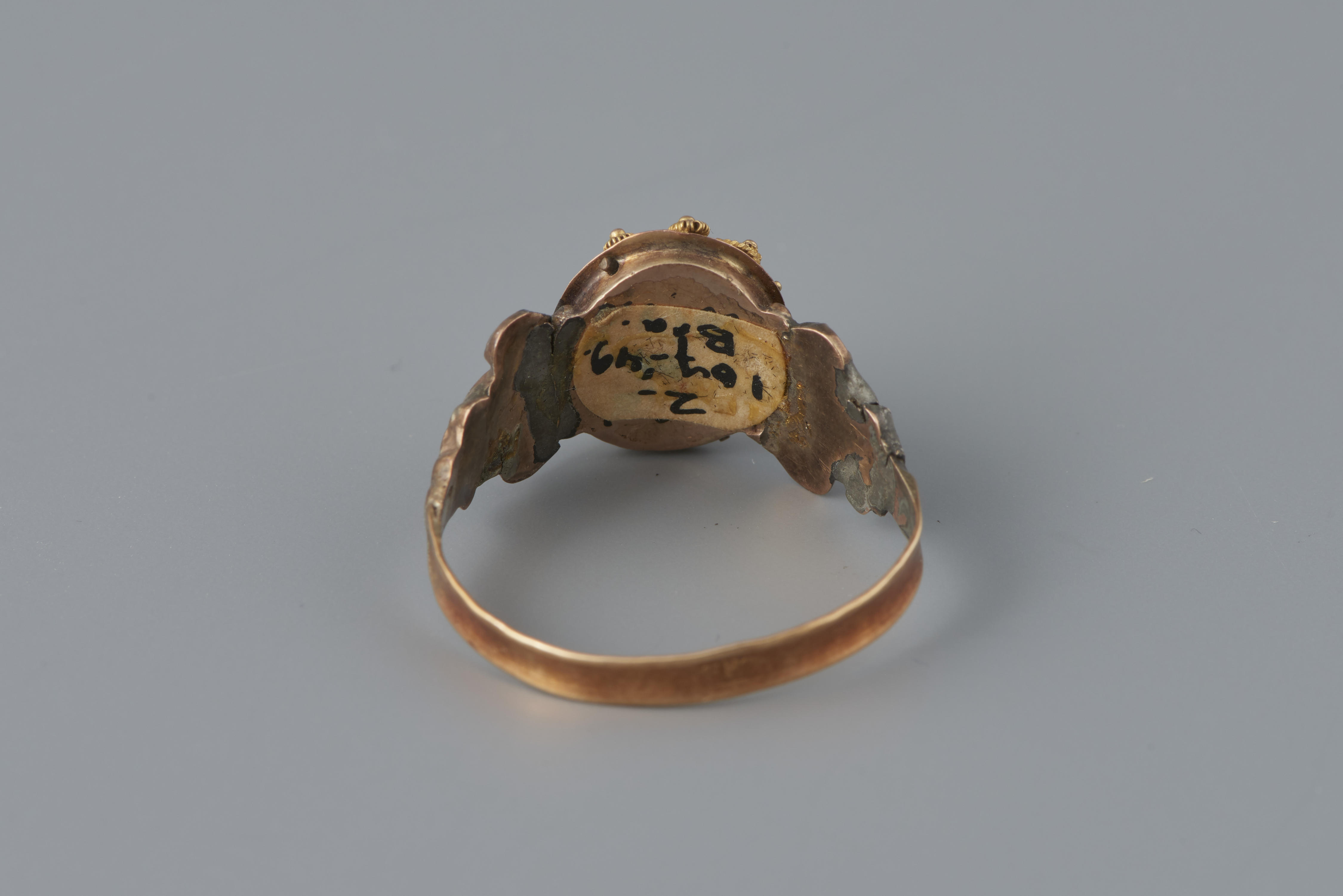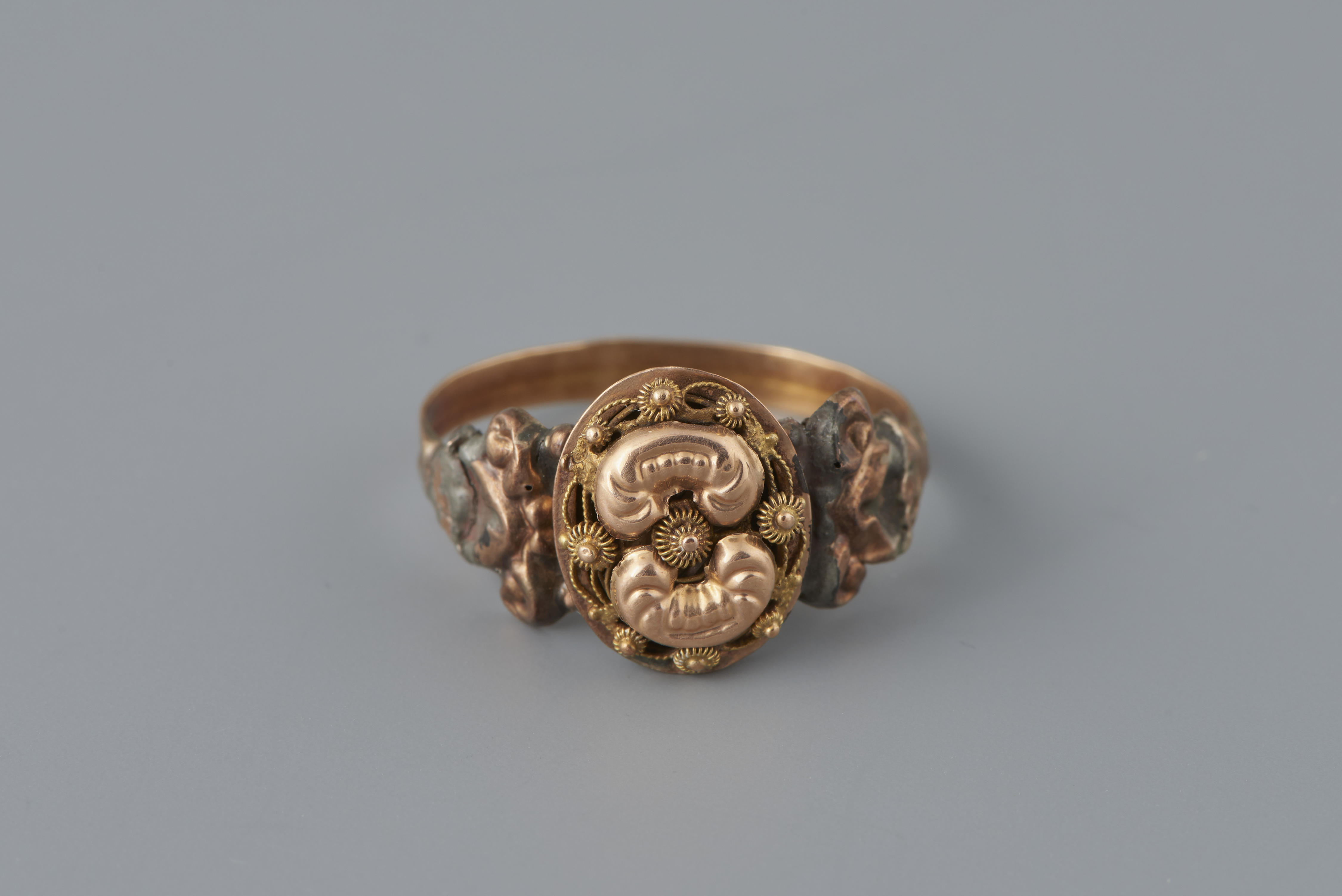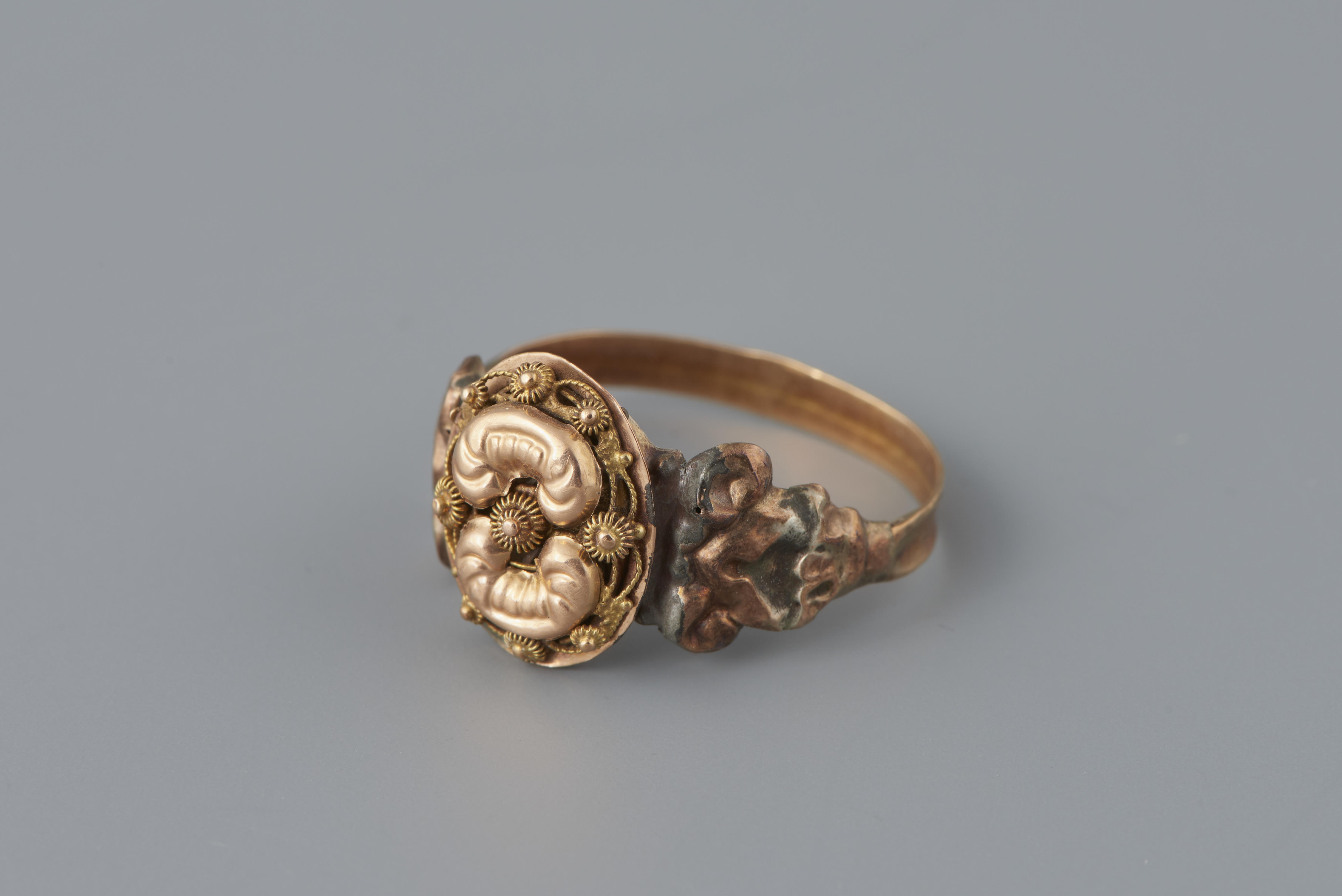 Ring van 14-karaats goud, gedragen door een vrouw uit Noord-Brabant. Dit type ring is niet specifiek streekgebonden en kan ook bij algemene modedracht gedragen zijn. Het meesterteken is wellicht van edelsmid E. Ruffin Jr. uit ‘s –Hertogenbosch, werkzaam in 1864. De ring heeft een gehaltemerk dat gebruikt is tussen 1853 en 1906.