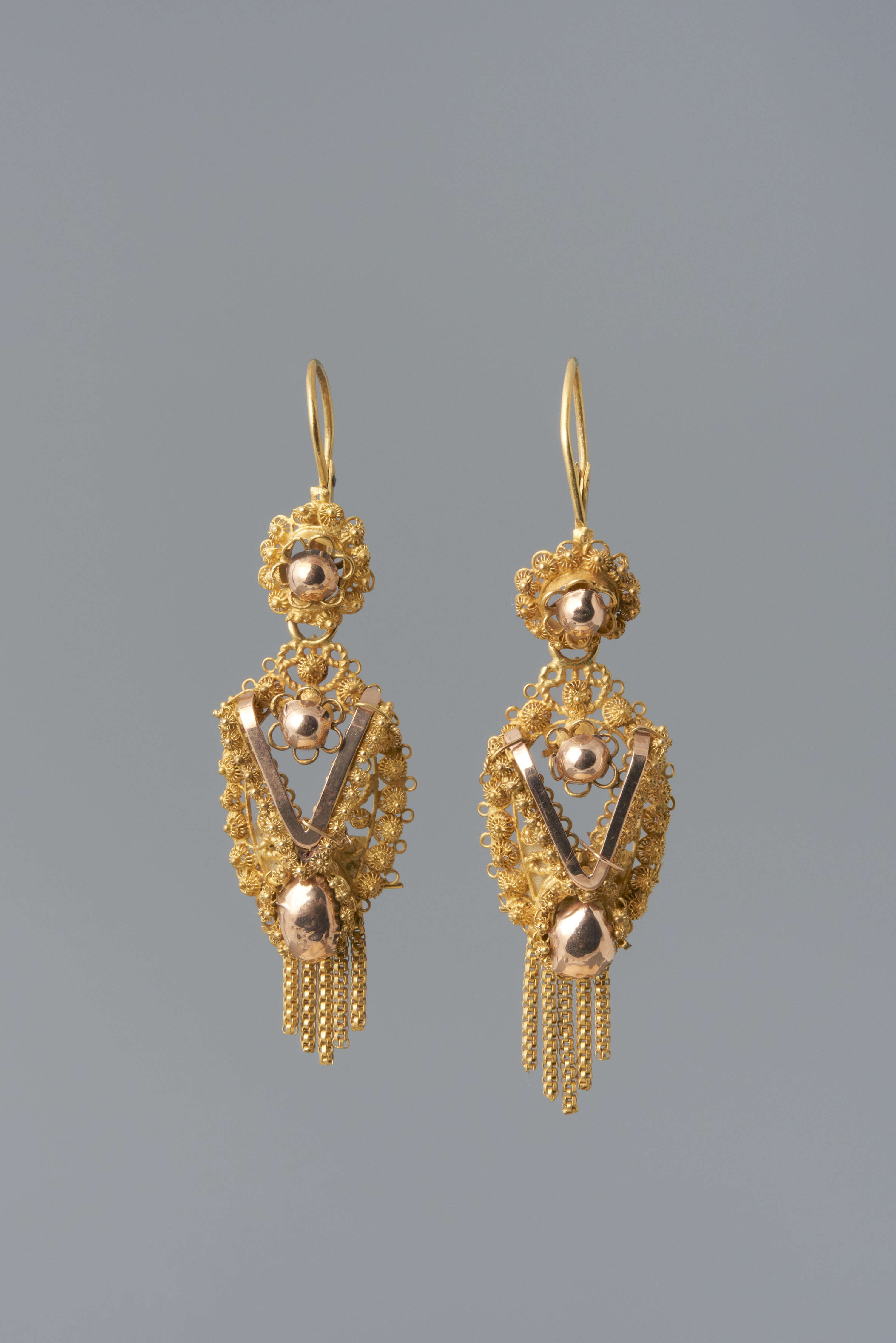 Paar 14-karaats gouden oorbellen. Dit type oorbel is niet specifiek streekgebonden en werd bij diverse streekdrachten gedragen. Deze exemplaren zijn gedragen door een vrouw uit Noord-Brabant. De vervaardiger is onbekend. De oorbellen hebben een gehaltemerk dat gebruikt werd tussen 1853-1906 en een gewichtsaanduidend merk dat gebruikt werd van 1865 tot 1906.
