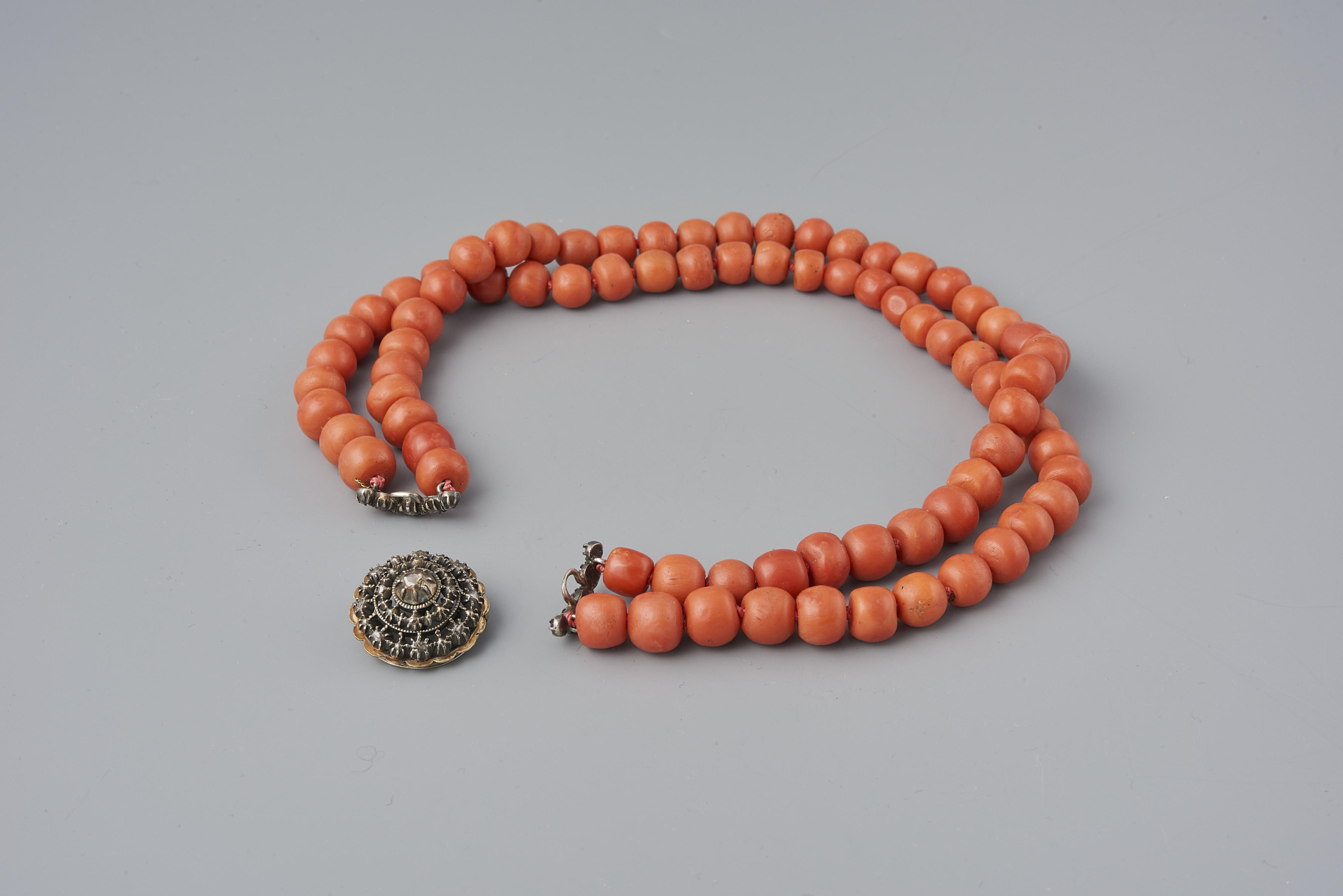 Halssnoer, bestaande uit een gegoten zilveren slot met gouden rand, ingelegd met diamantjes en daaraan twee strengen bloedkoralen. Het slot is in 1944 verworven zonder kralen. In 1960 zijn er twee strengen bloedkoralen aangezet. Het slot is gedragen door een vrouw uit Noord-Holland. De vervaardiger is onbekend.