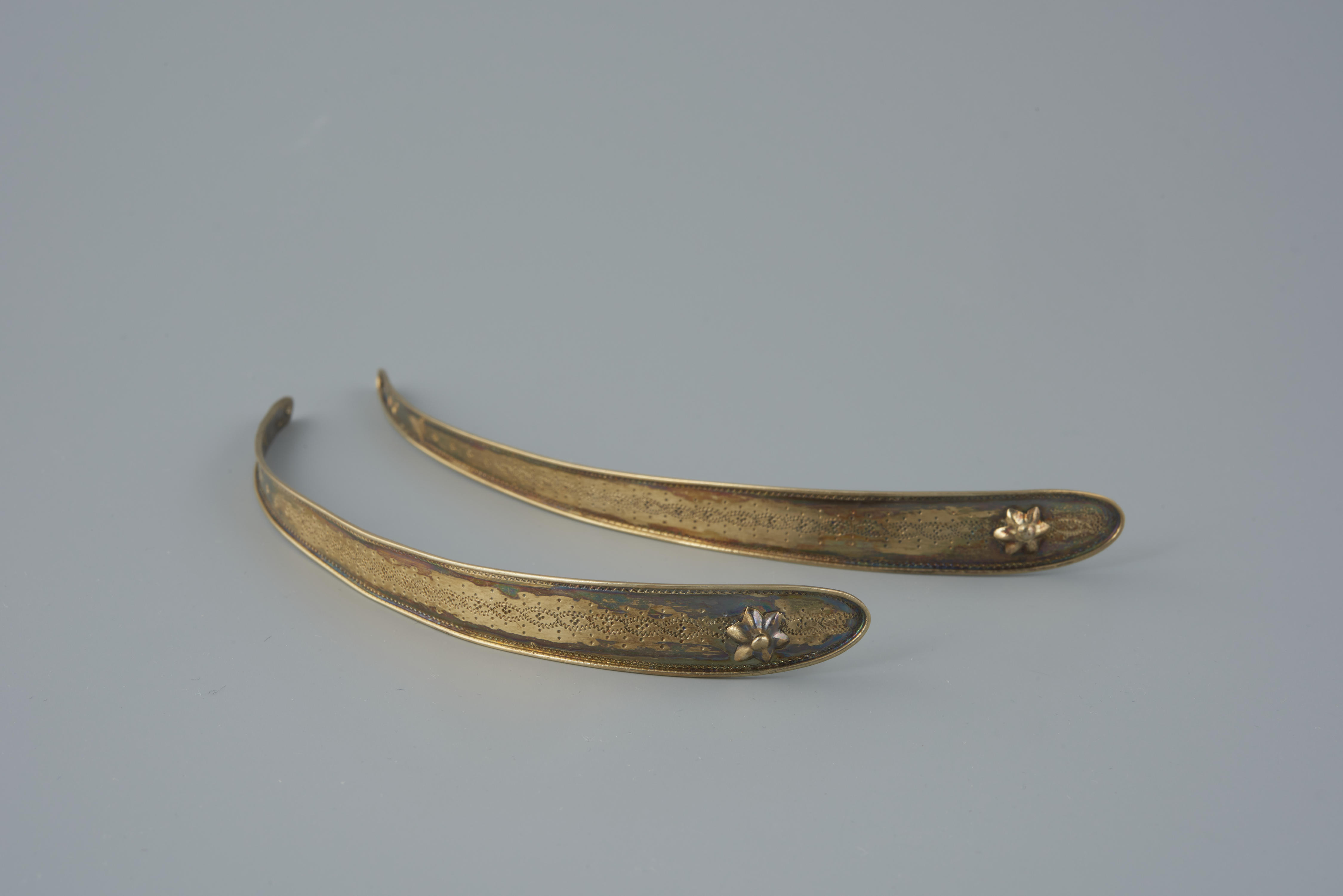Paar vergulde zilveren zijnaalden, gedragen door een vrouw uit de Zaanstreek. De zijnaalden zijn in 1887 door J. Spel in Hoorn gemaakt.