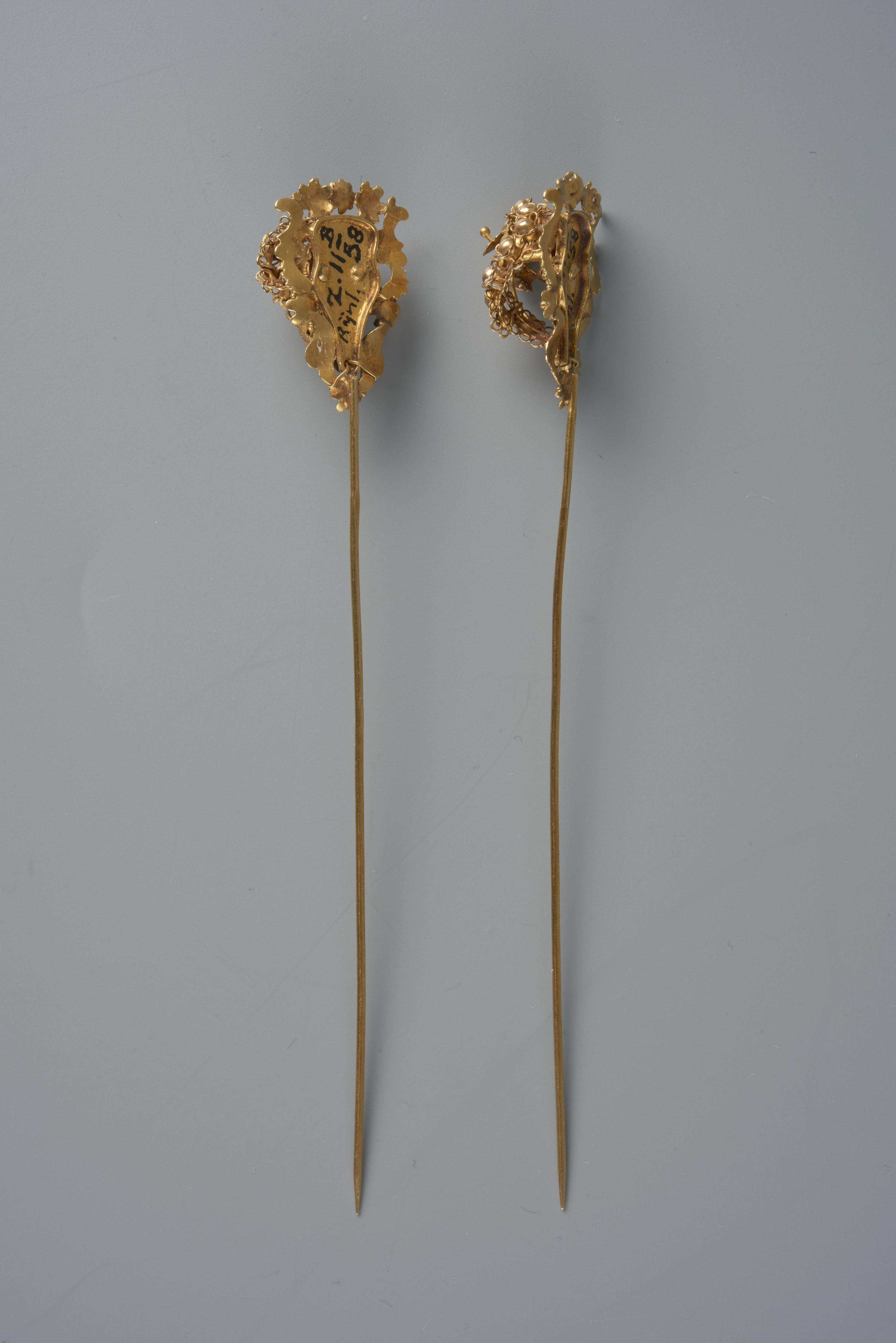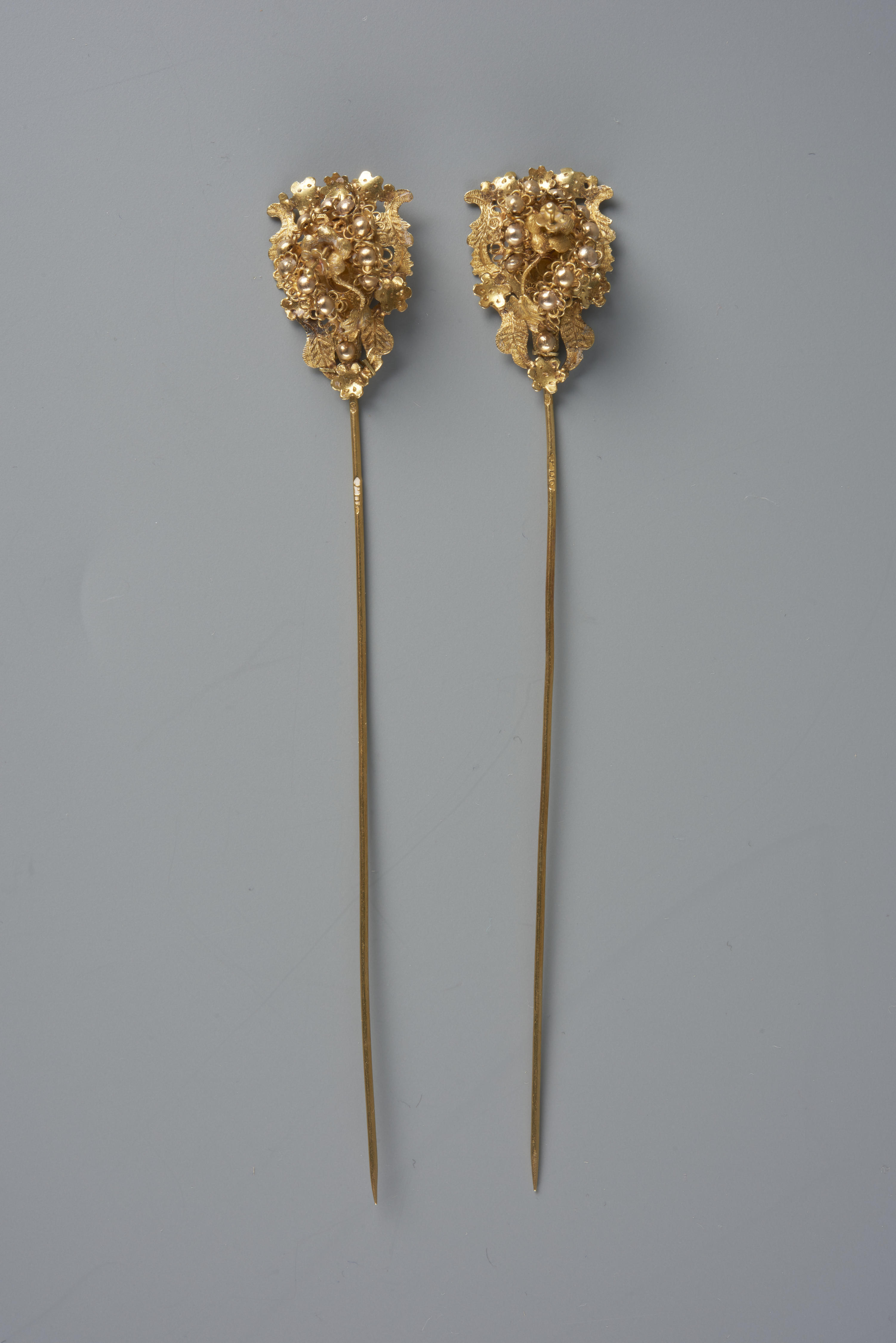 Paar gouden kapspelden, gedragen in het Rijn- en Delfland. De spelden zijn gemaakt door J.P.J. Driessen in Leiden, werkzaam tussen 1873-1924. Ze hebben een gehaltemerk dat tussen 1906-1953 is gebruikt. Hieruit is te concluderen dat de spelden tussen 1906 en 1924 gemaakt zijn. Kapspelden werden verticaal in de muts gestoken, achter de oorijzeruiteinden.