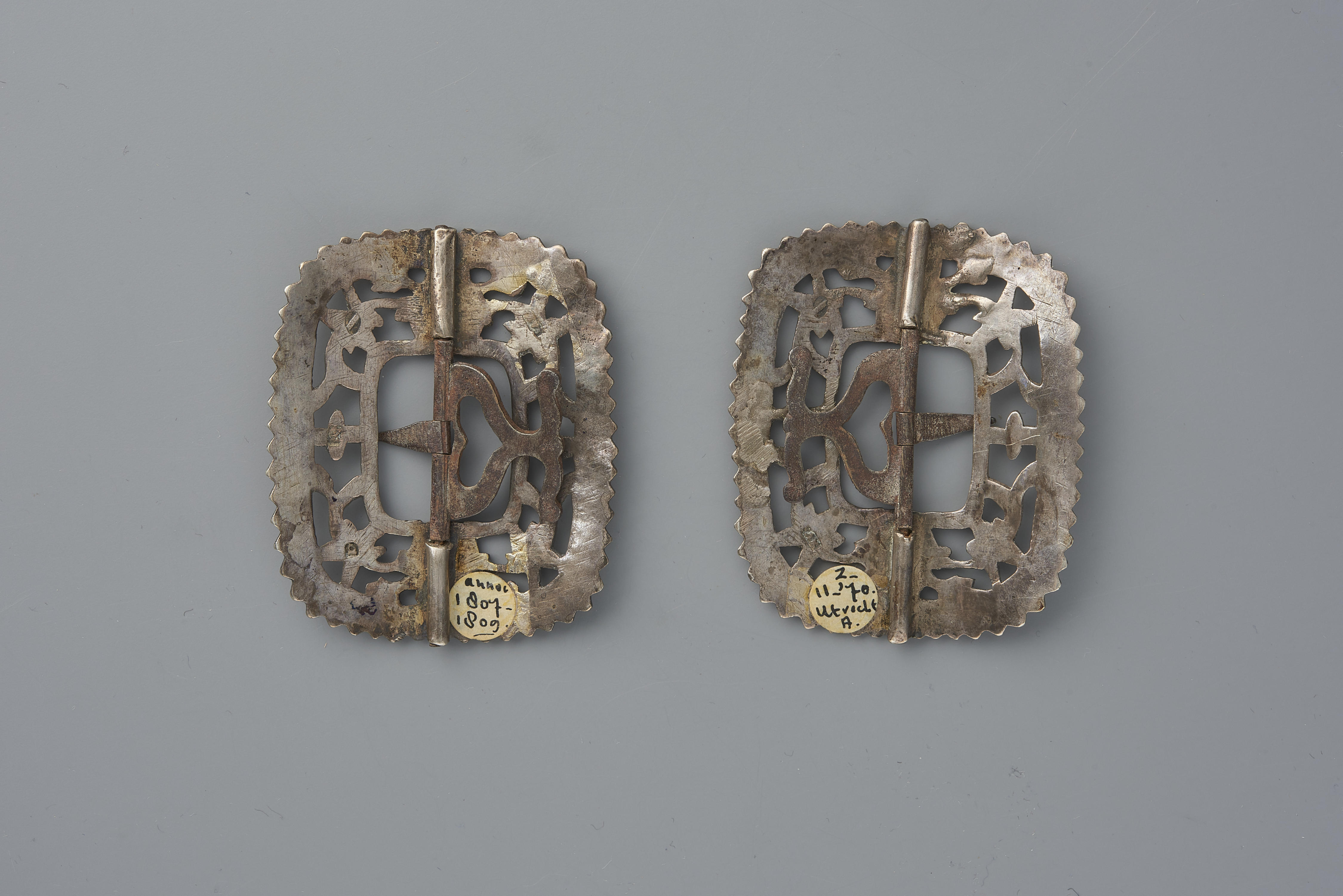 Paar zilveren schoen- of kuitgespen, gedragen in de provincie Utrecht. De gespen hebben een jaarletter die gebruikt is tussen 7 oktober 1807 en 18 maart 1809. Het meesterteken is een gildekeur en wellicht afkomstig van zilversmid A. Kooiman uit Schoonhoven.