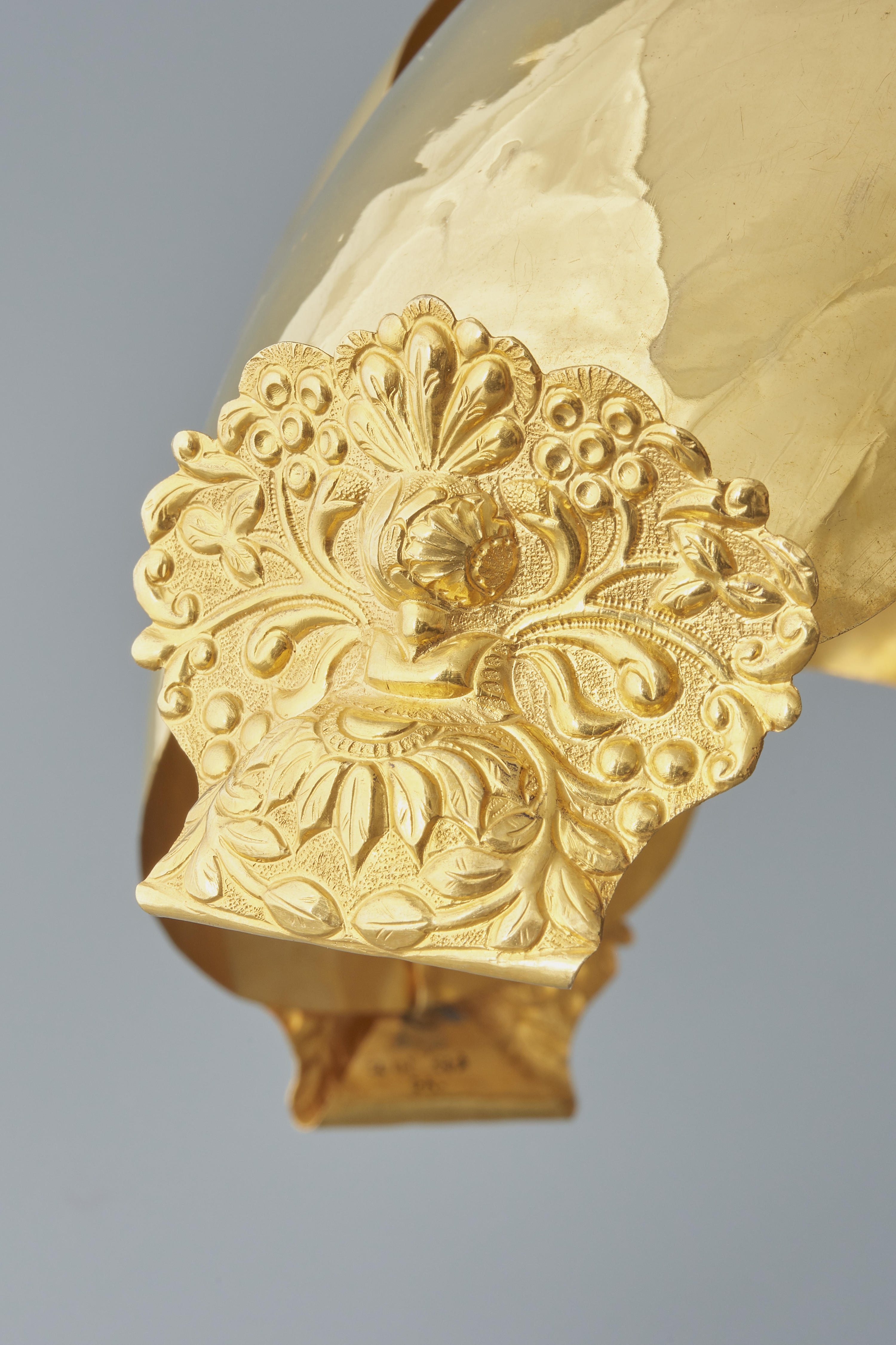 Een verguld messing oorijzer met vergulde messing stiften. Dit type stiften wordt in Noord-Nederland wel 'potknop' genoemd. De stiften en de beugel zijn in 1942 als afzonderlijke delen van dezelfde eigenaar verworven. In 1962 zijn ze in opdracht van het Nederlands Openluchtmuseum samengevoegd. Een dergelijk oorijzer zou gedragen kunnen zijn door een vrouw in streekdracht ...