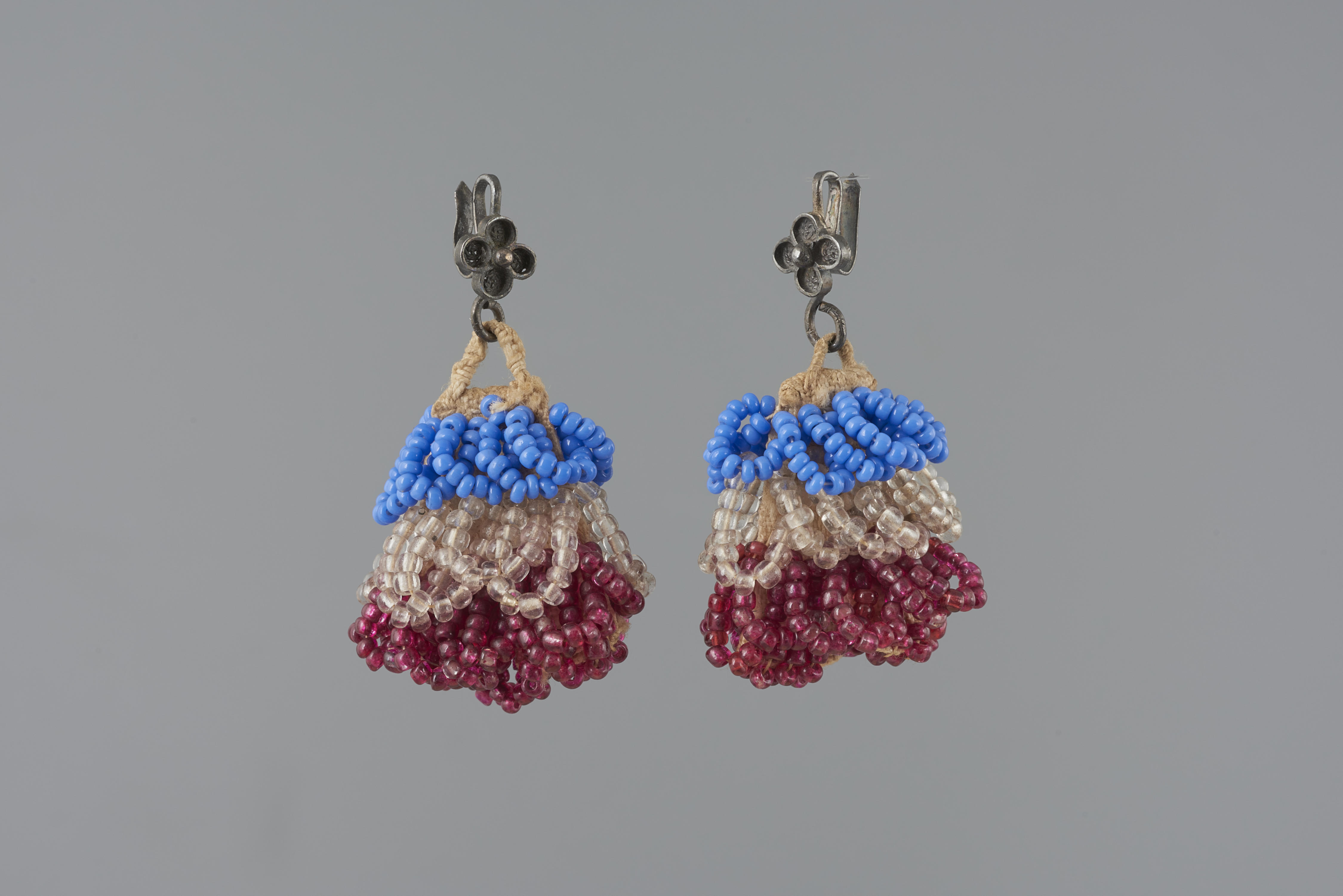 Paar akertjes van kralenwerk met akerhaakjes van tweede gehalte zilver. De haakjes hebben een gehaltemerk dat gebruikt is van 1814 tot 1906. Het kralenwerk is op een in linnenbinding geweven bandje gezet. Akertjes werden op Marken gedragen aan de punten van de schouderdoekjes.