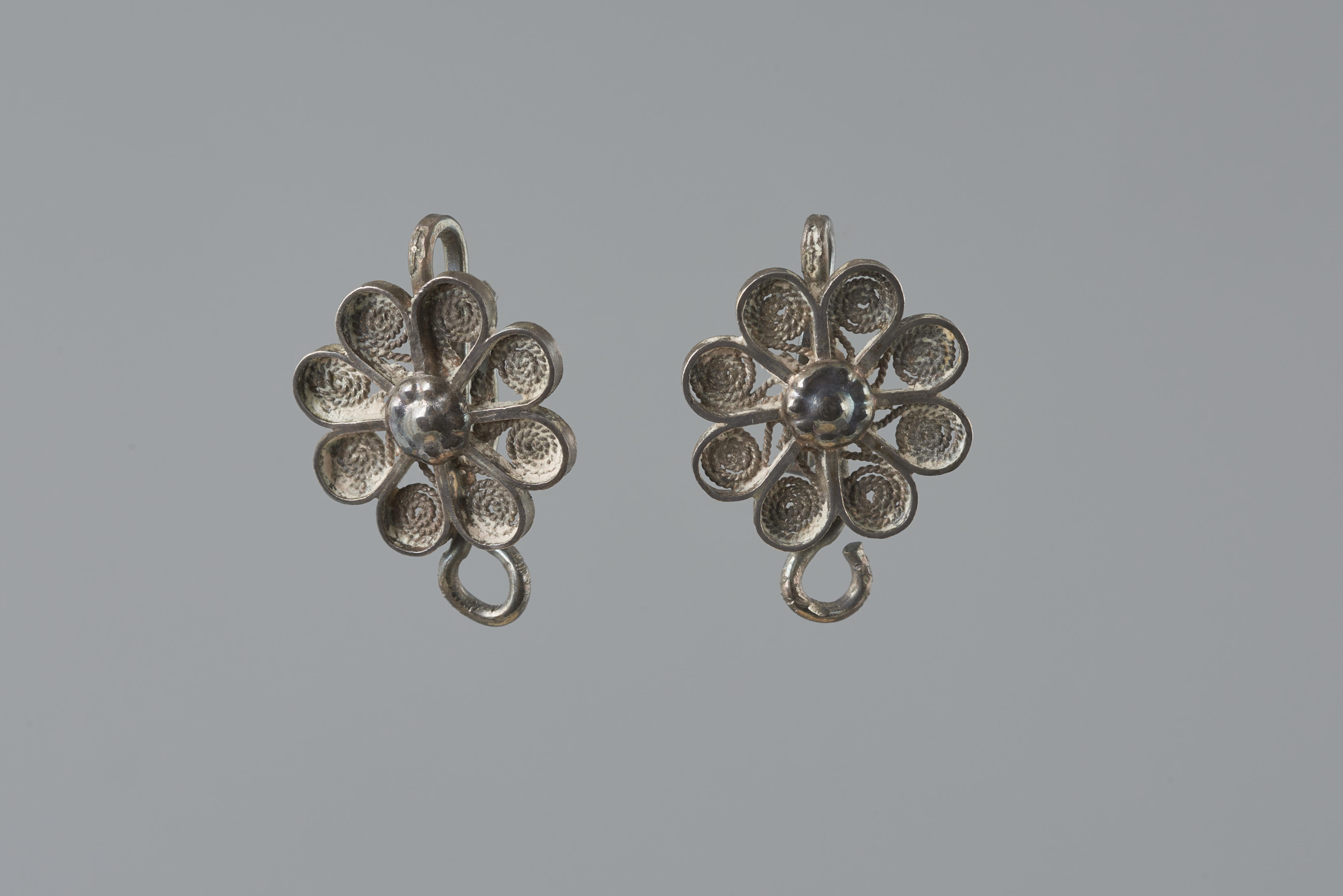 Een paar zilveren akerhaakjes, gedragen op het eiland Marken. Akerhaakjes worden gebruikt om akertjes aan de punten van een schouderdoek te haken. Ze zijn vervaardigd door Gerrit Wijnoogst, werkzaam in Amsterdam tussen 1884 en 1886.