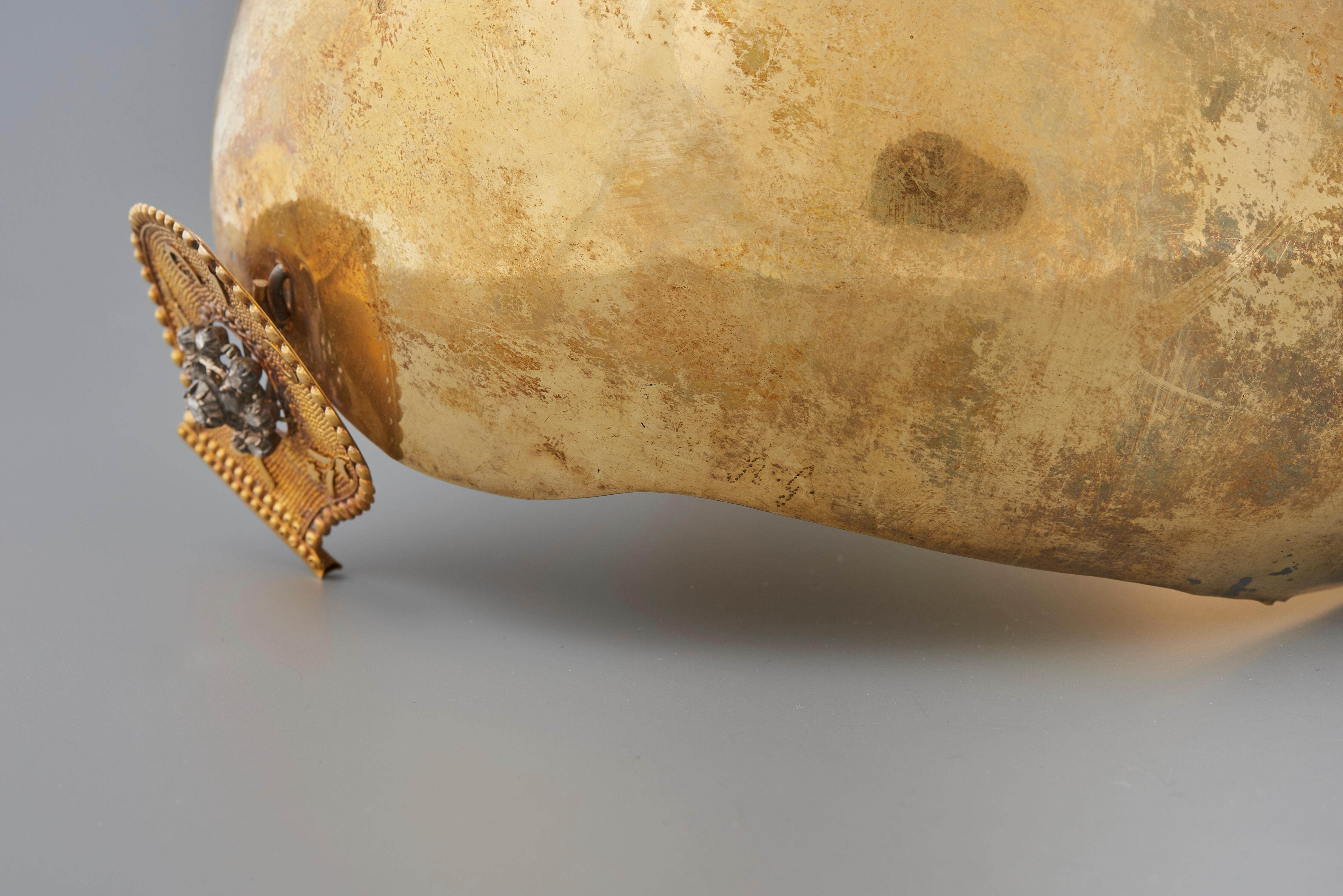 Een verguld zilveren oorijzerbeugel met daaraan een paar gouden stiften. Op de gouden stiften is een rozetje gezet met roosdiamantjes in een zilveren vatting. De losse stiften werden in 1949 door het Openluchtmuseum verworven. Ze zijn in 1958 in opdracht van het museum aan een vergulde zilveren beugel gezet. Het oorijzer geeft een beeld van ...