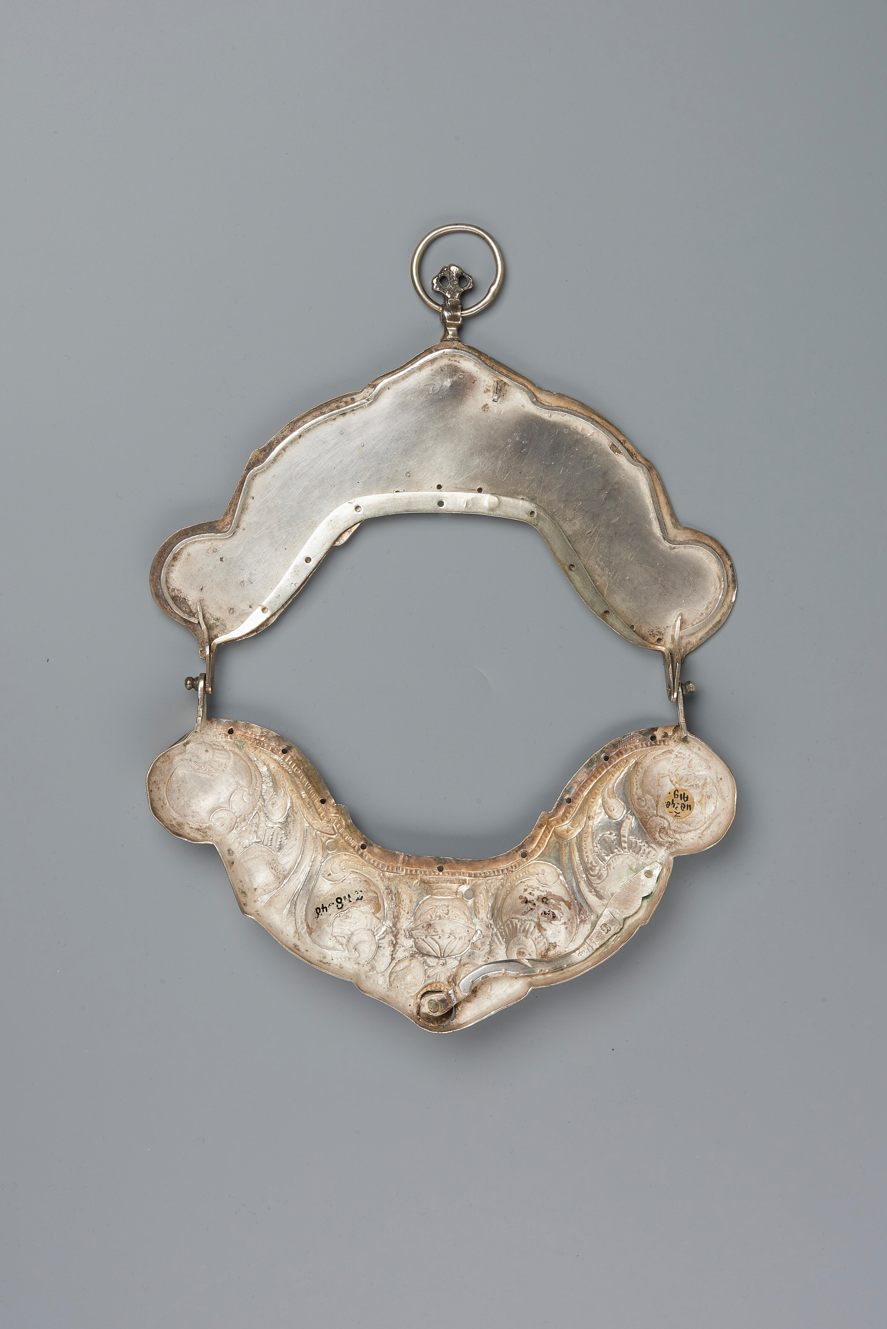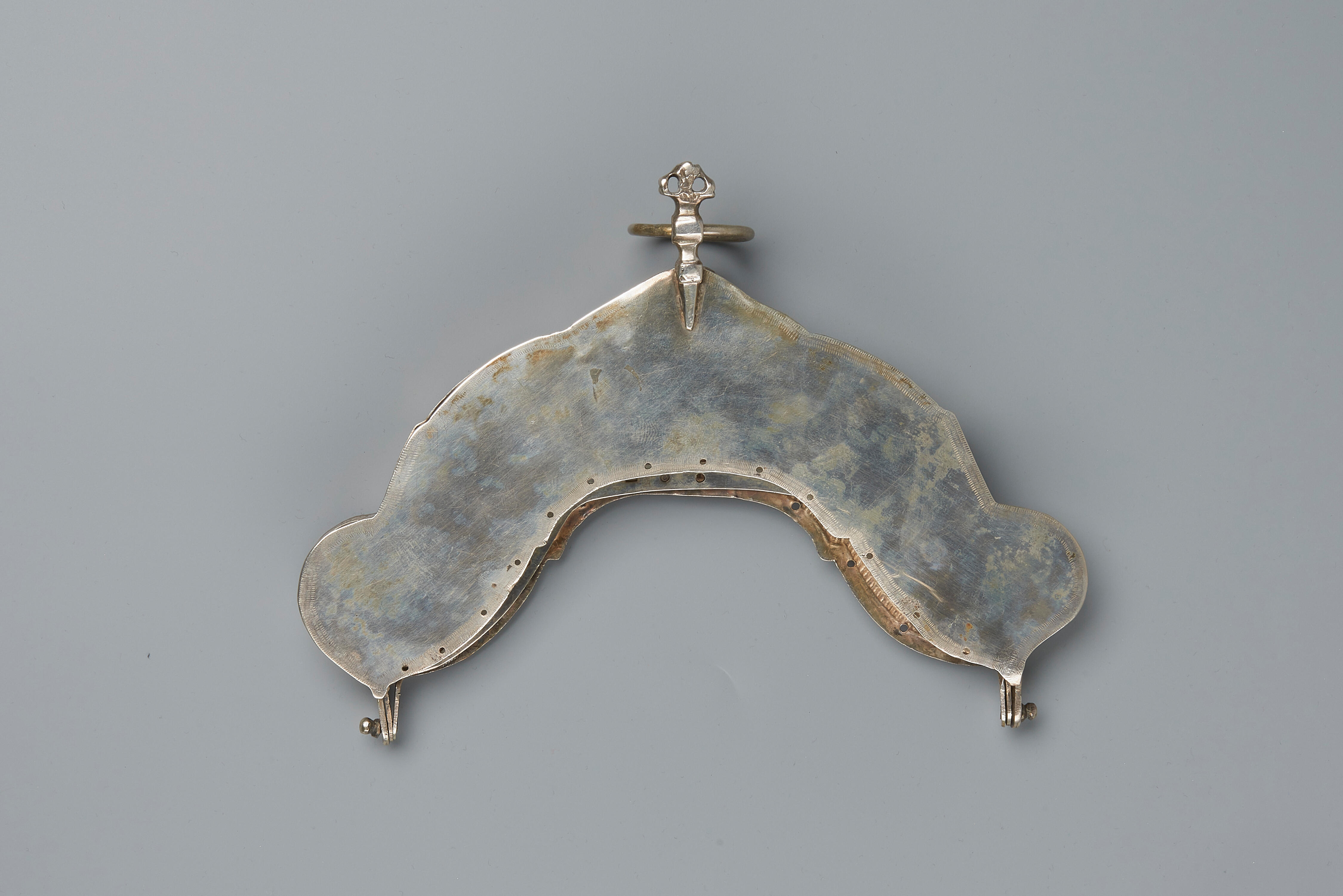 Een zilveren tasbeugel, vervaardigd door J. Brocades in Meppel. In de tasbeugel staat de jaarletter van 1837. Het front van de beugel is gedreven. Enkele onderdelen, zoals het vrouwfiguurtje bovenop, zijn gegoten. Op de bovenrand is de beugel versierd met graveerwerk. De rokhaak ontbreekt. Dit type tasbeugel werd onder meer gebruikt in Staphorst en Rouveen.