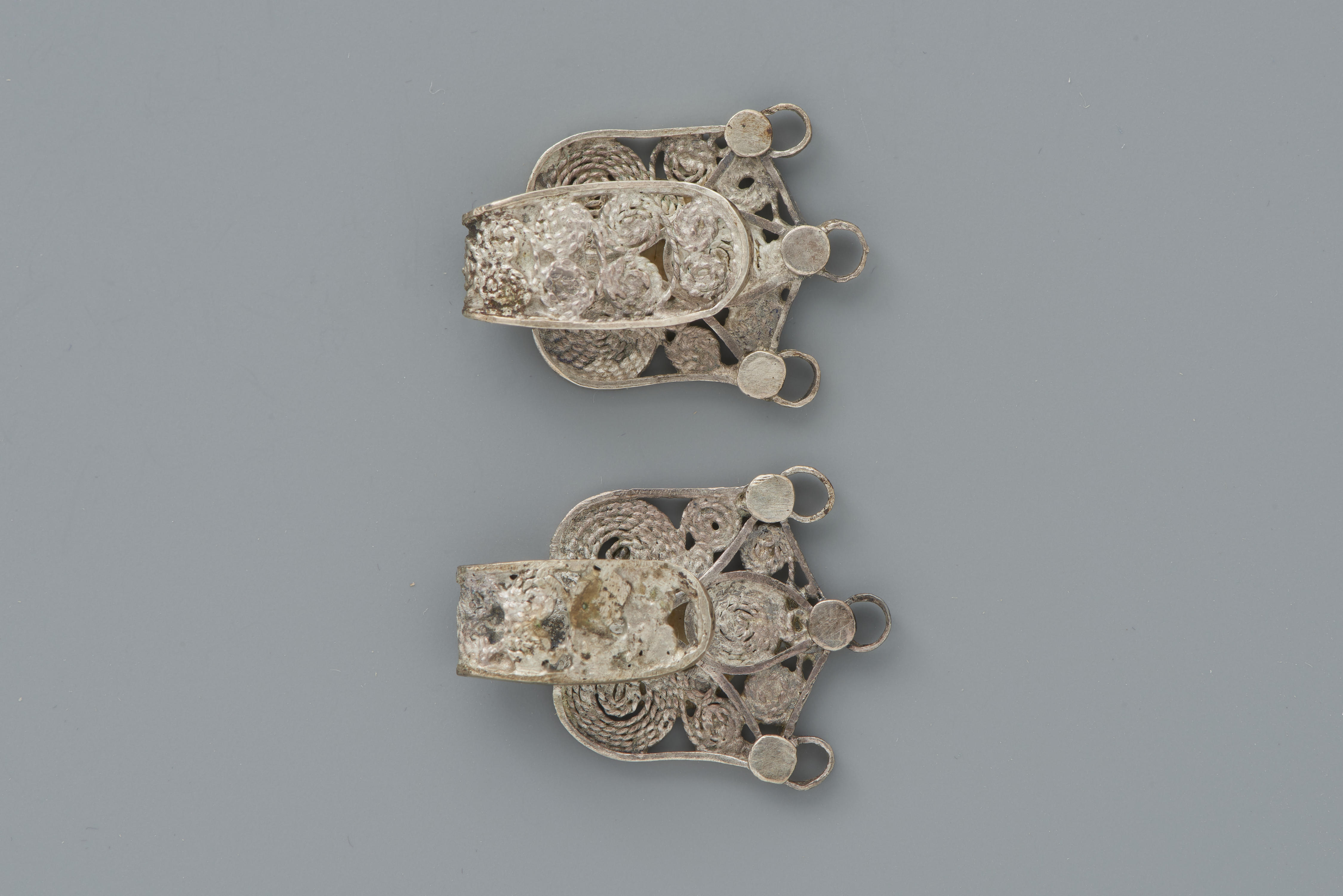 Twee tulpvormige zilveren keelbandhaken waarmee de keelband aan de muts werd bevestigd. De haken hebben een gehaltemerk dat gebruikt is tussen 1906-1953. Ze zijn gedragen op Marken.