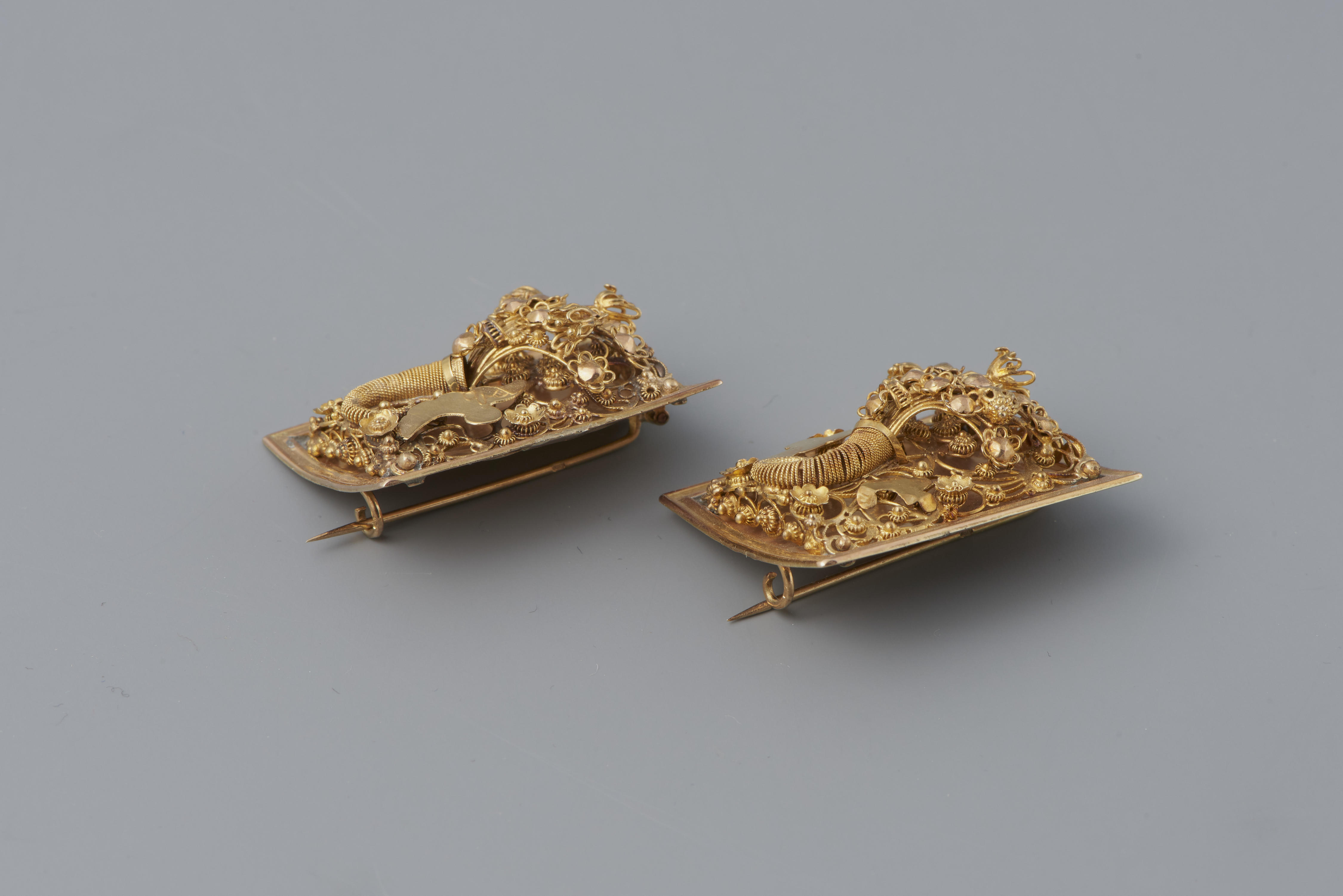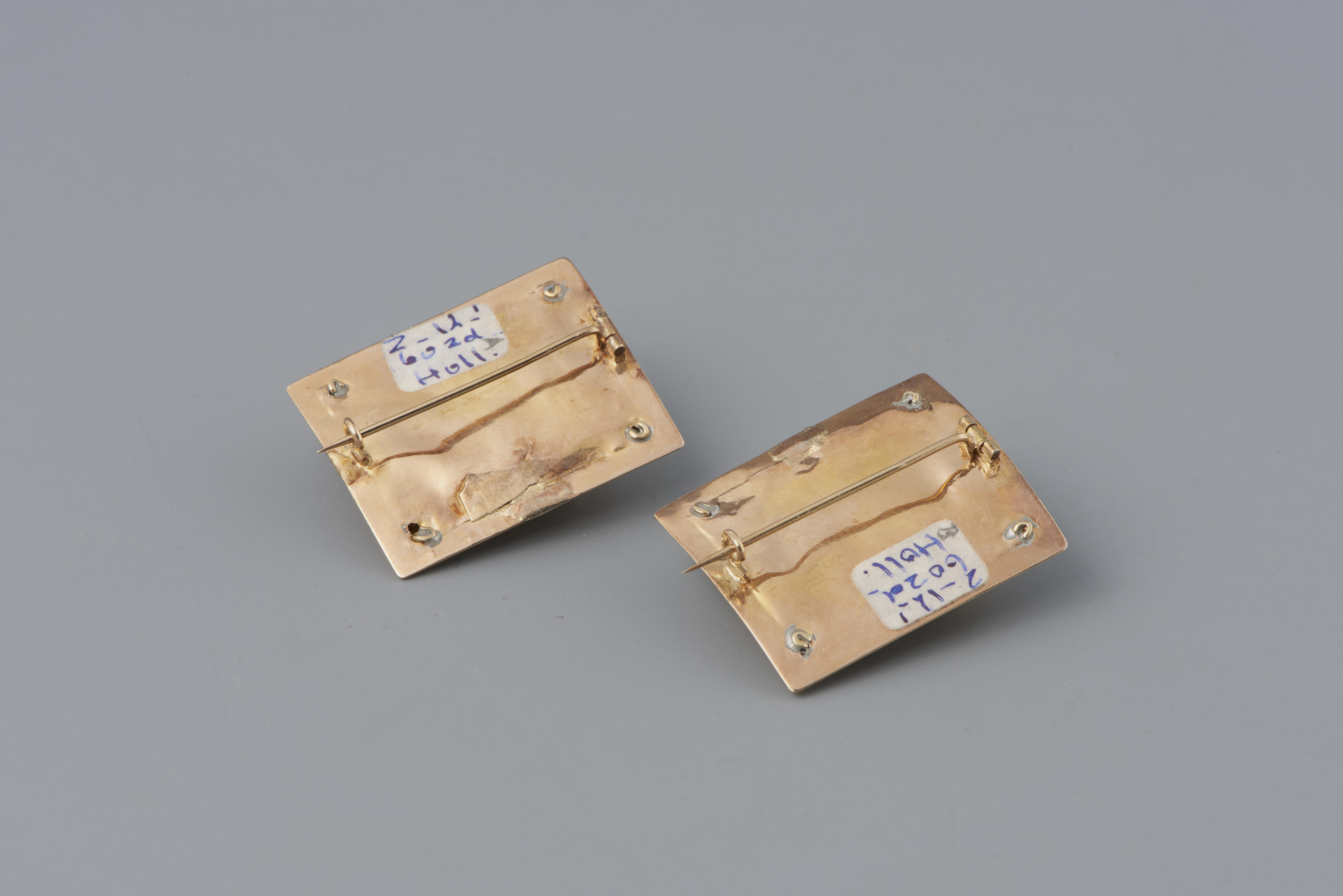 Tot broches vermaakte oorijzerboeken van 18 karaats goud. De boeken zijn afkomstig van een Zuid-Hollands oorijzer en hebben geen meesterteken. Ze zijn gemaakt in de negentiende eeuw. Op de 14 karaats gouden spelden staat een gehalteteken dat na 1955 in gebruik kwam. De boeken zijn dus na 1955 tot broche vermaakt.