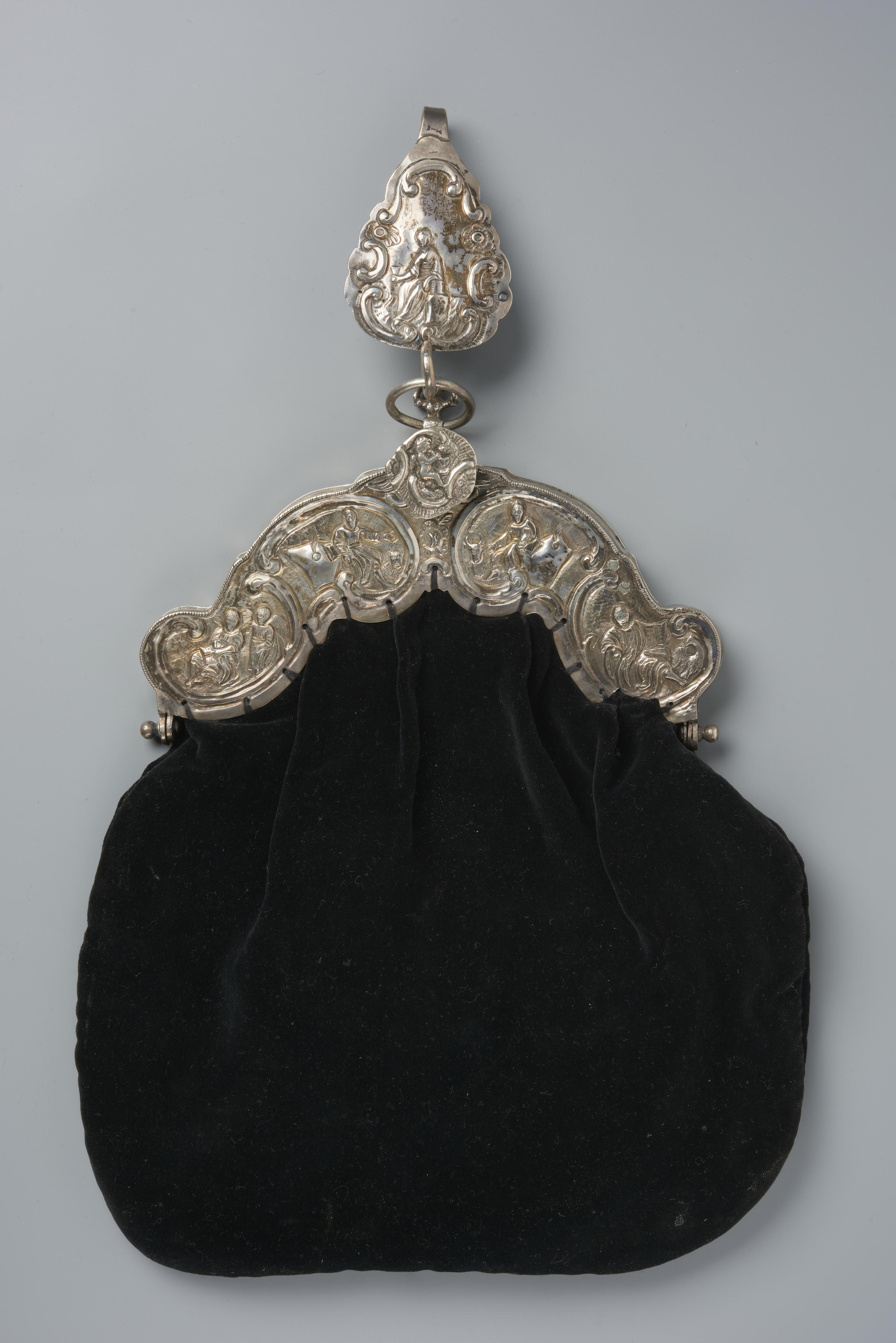 Beugeltas, gedragen door een vrouw uit de provincie Friesland. Op de beugel zijn de vier evangelisten afgebeeld. De haak is in 1814 vervaardigd door J.P. Paulides uit Heerenveen. De beugel is niet gemerkt. In de gladde achterzijde van de beugel zijn de initialen ‘B.S.S.’ en het jaartal ‘1858’ gegraveerd.