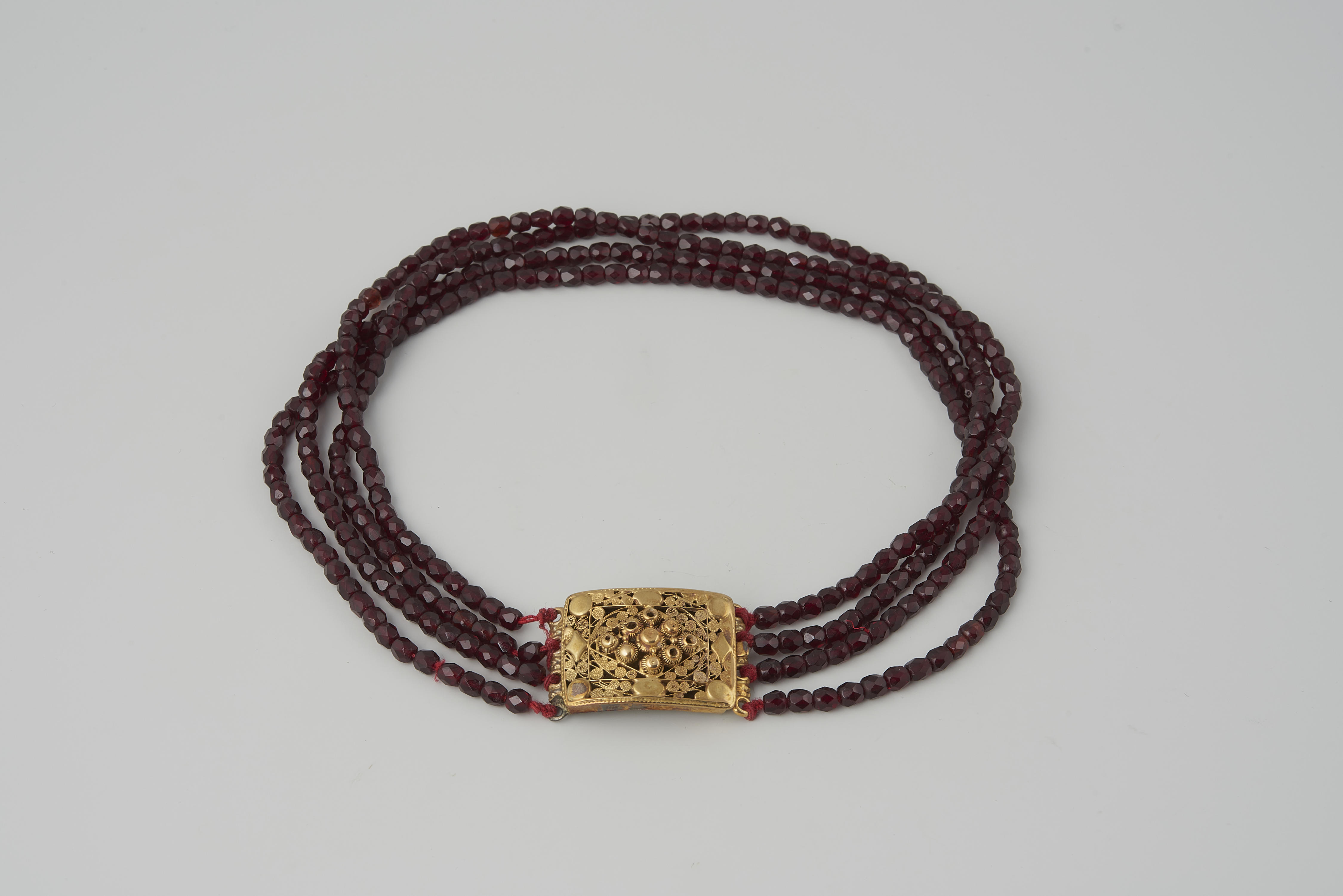 Halssnoer, bestaande uit een 18-karaats gouden slot met vier strengen glazen kralen. Het slot is in 1949 aangeschaft zonder kralen. In 1968 zijn er in het museum kralen aangezet. Het slot is gedragen door een vrouw van het Kampereiland. Dit model slot werd ook op Urk, op de Veluwe en in 't Gooi gedragen. De ...